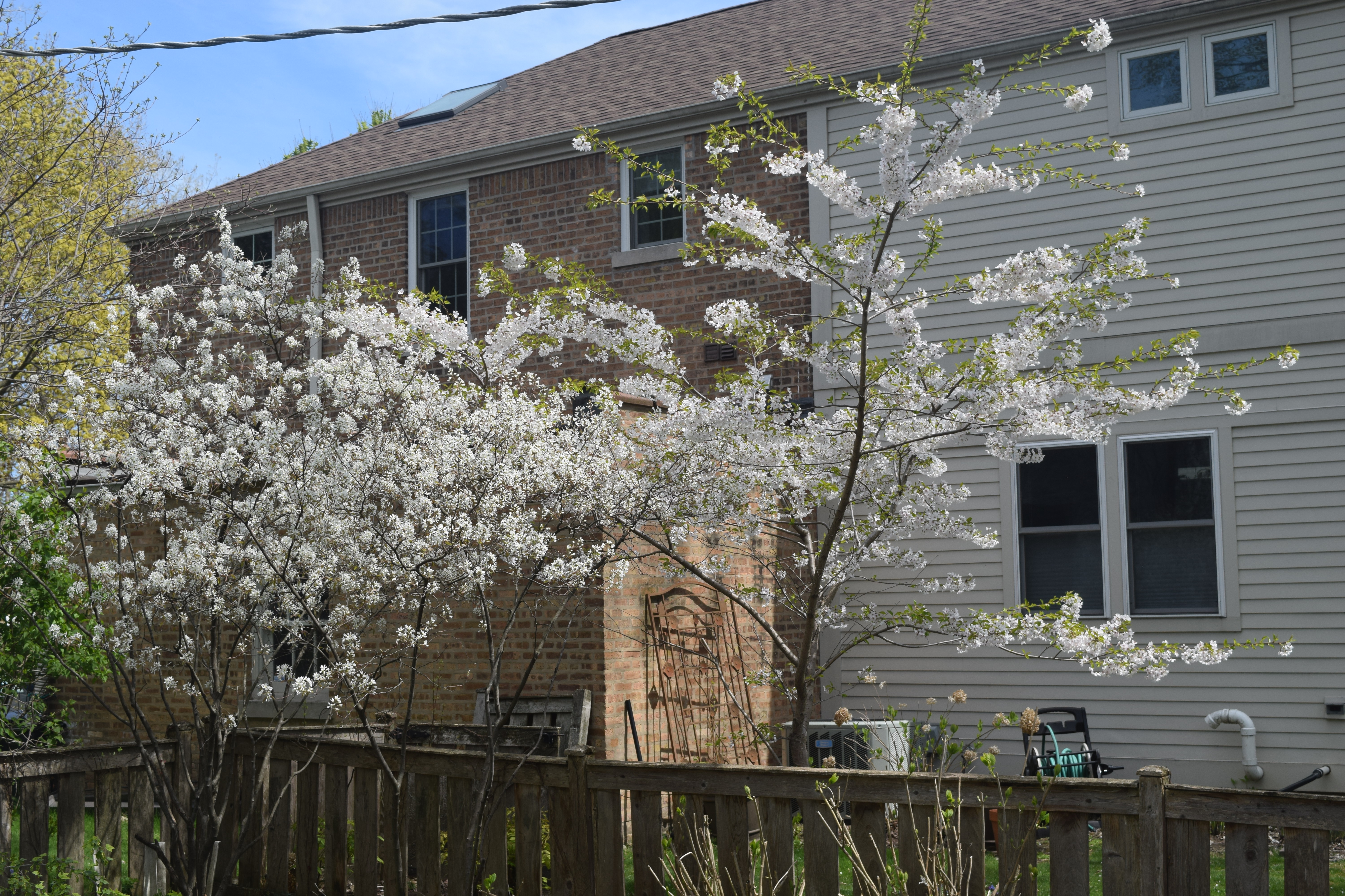 Yoshino Cherry right, Serviceberry left. Neighbor’s house at back.
