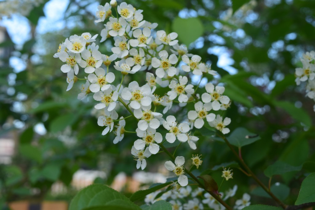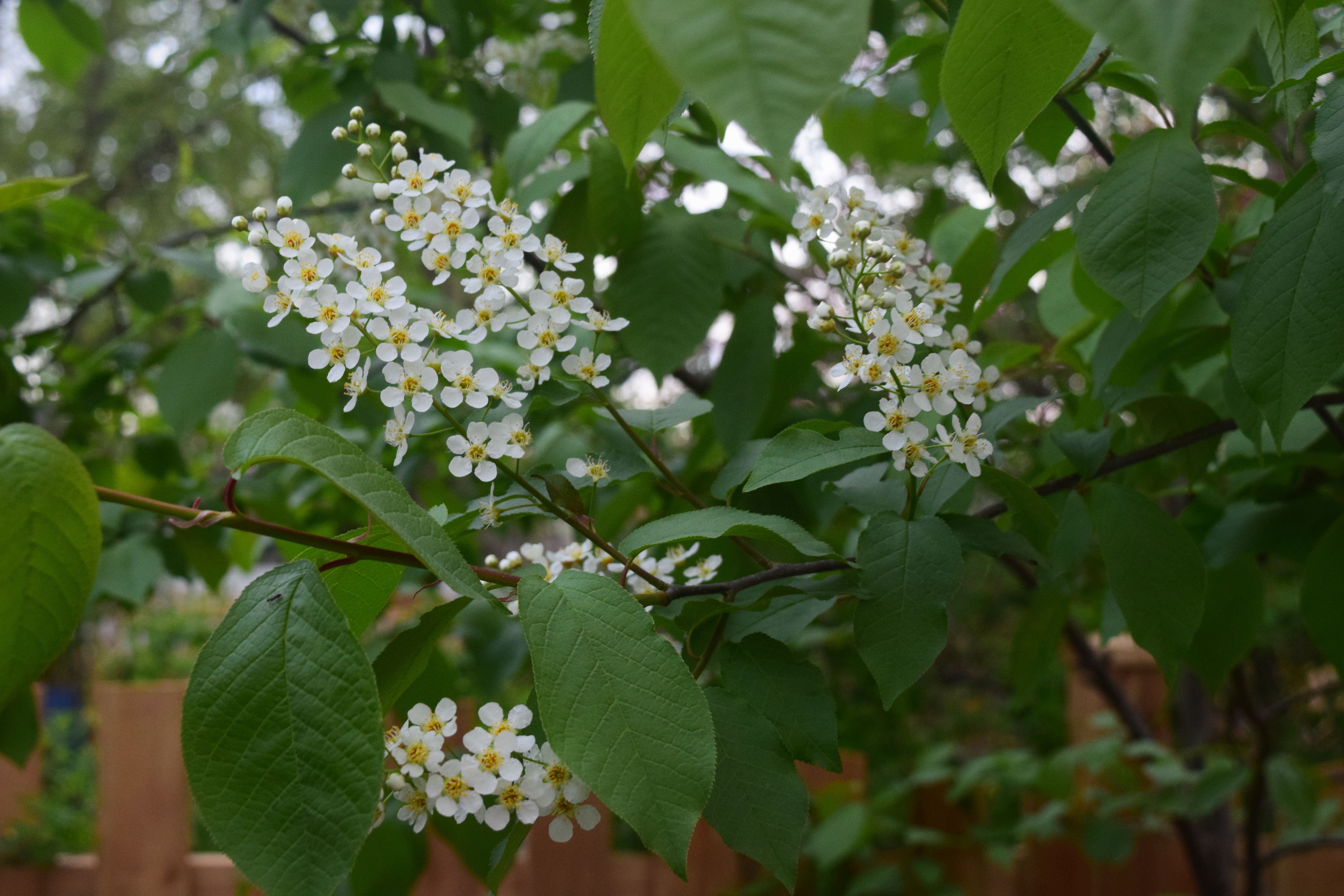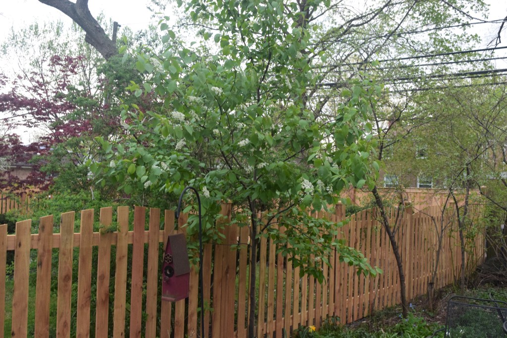 The Chokecherry in our Back Garden, in front of the neighbors’ new fence. Sorry the light isn’t very good.