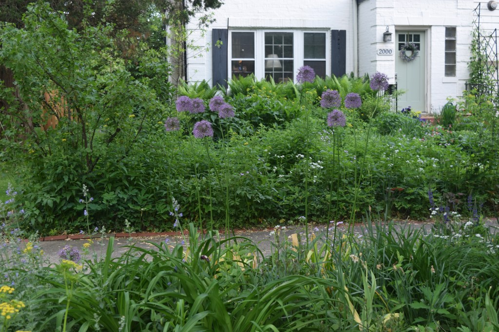 This is the same patch looking the other direction. I did discover this May that Clematis ‘Guernsey Cream’ is a nice companion for this Allium variety.