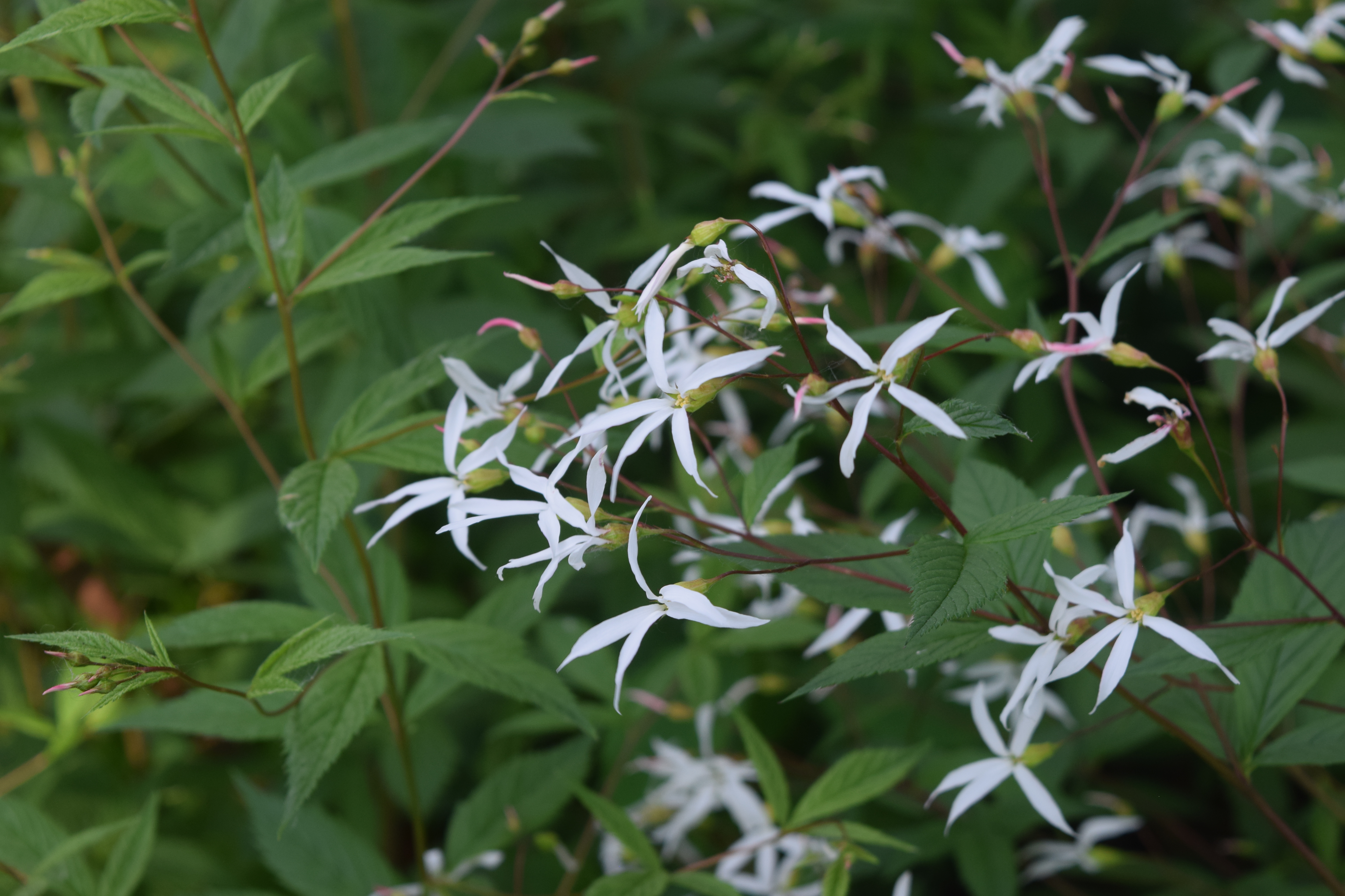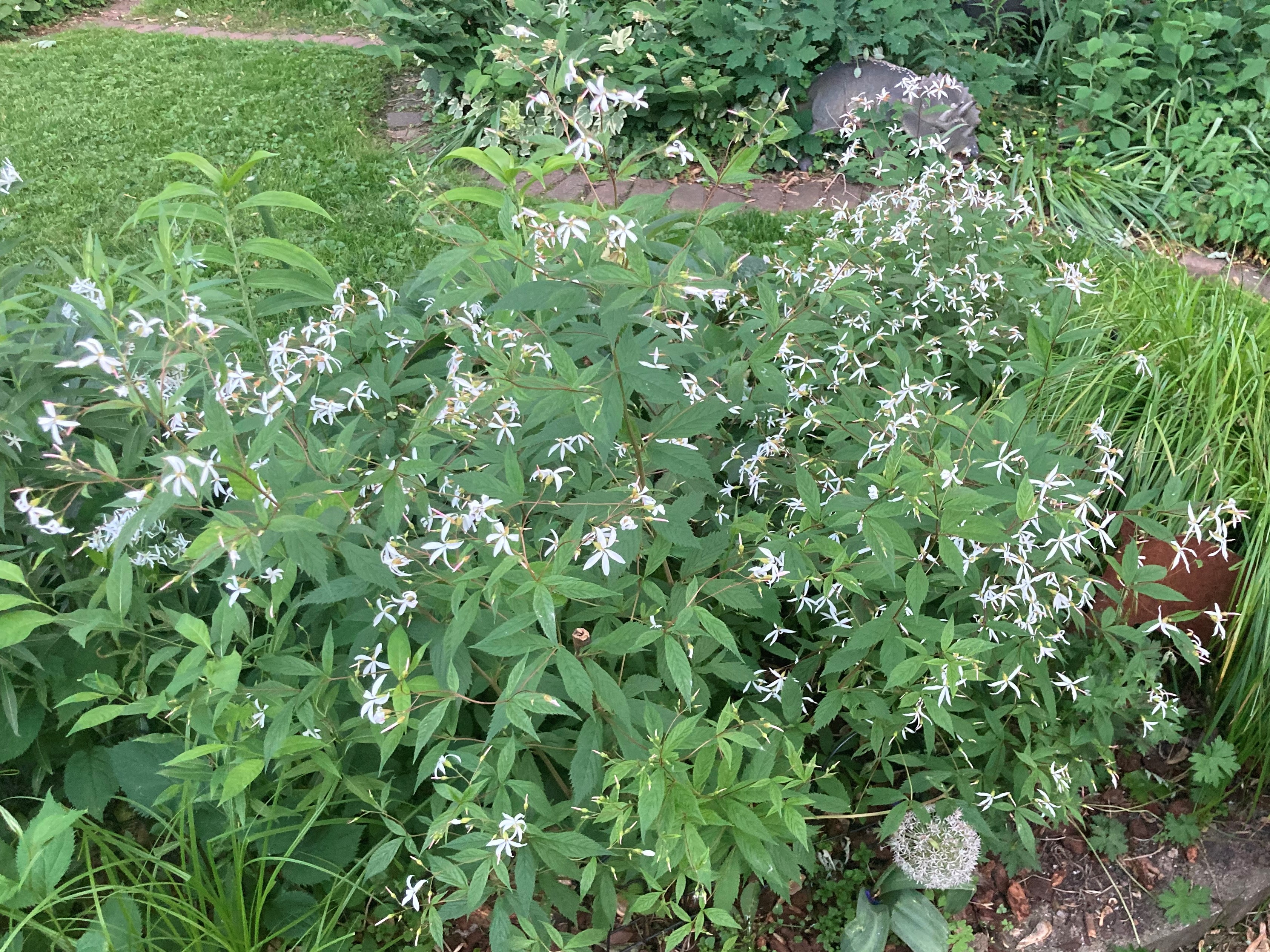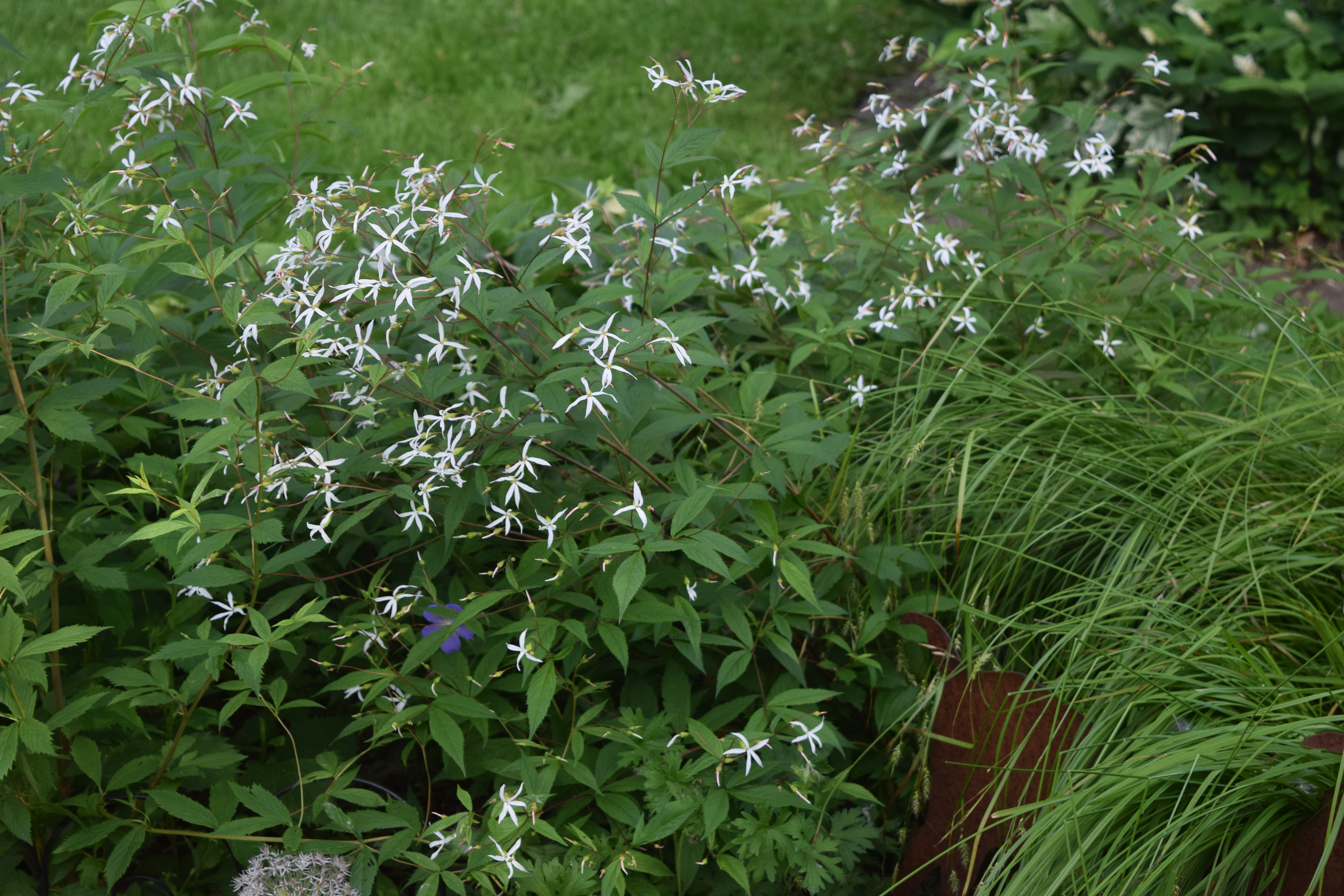 Last fall I added another three Bowman’s Root (Porteranthus trifoliatus) to the raised bed in the shady Back Garden and I really like how they are filling in and flowering more profusely.