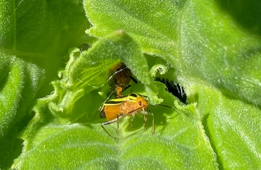 The very next day I was inspecting an annual Sunflower plant when I observed a Spined Soldier Bug! And he was eating an FLPB! In case you’re wondering, Spined Soldier Bugs attack their prey with sharp beaks that stay hidden under their abdomens until the moment of truth.