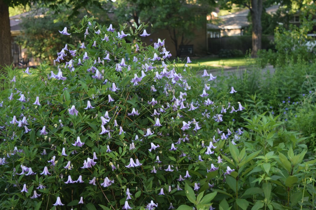 That is one gorgeous wall of purple. I’ve never tried Clematis – for some reason I’m not into growing vining flowers although, when I lived in Wichita, Kansas years ago, our little house came with a wall of orange trumpet vine. The Betty Corning fascinates me – not sure I have ever seen it. Love those bell like flowers.