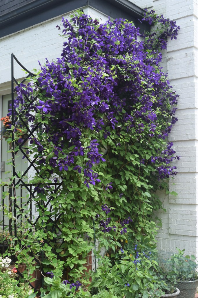 On the other hand, this season the ‘Jackmanii’ are filling a third trellis. The first two trellises are hung on the brick wall, but this year I pushed a third trellis into the ground along the porch railing, and attached it discretely as I could.