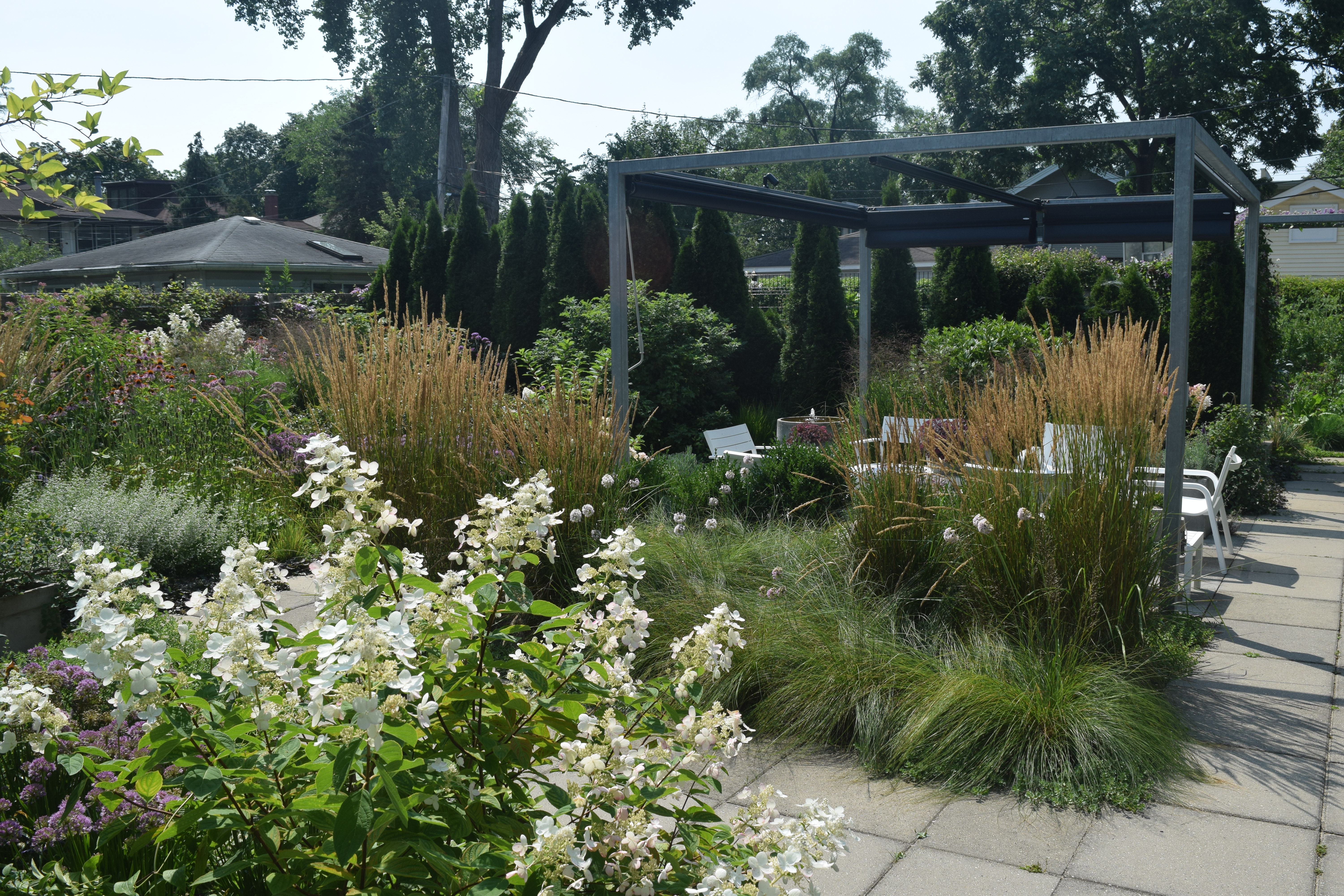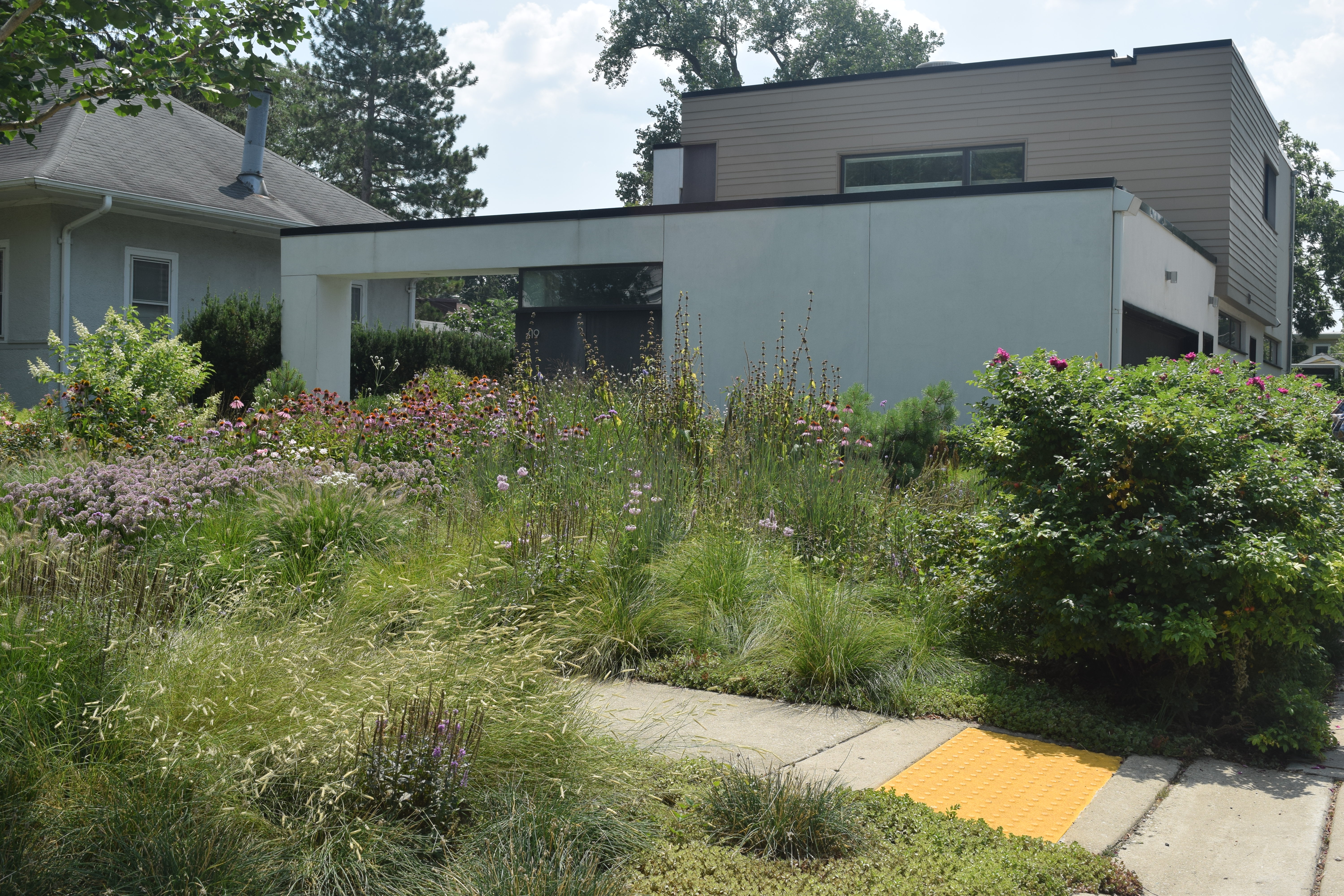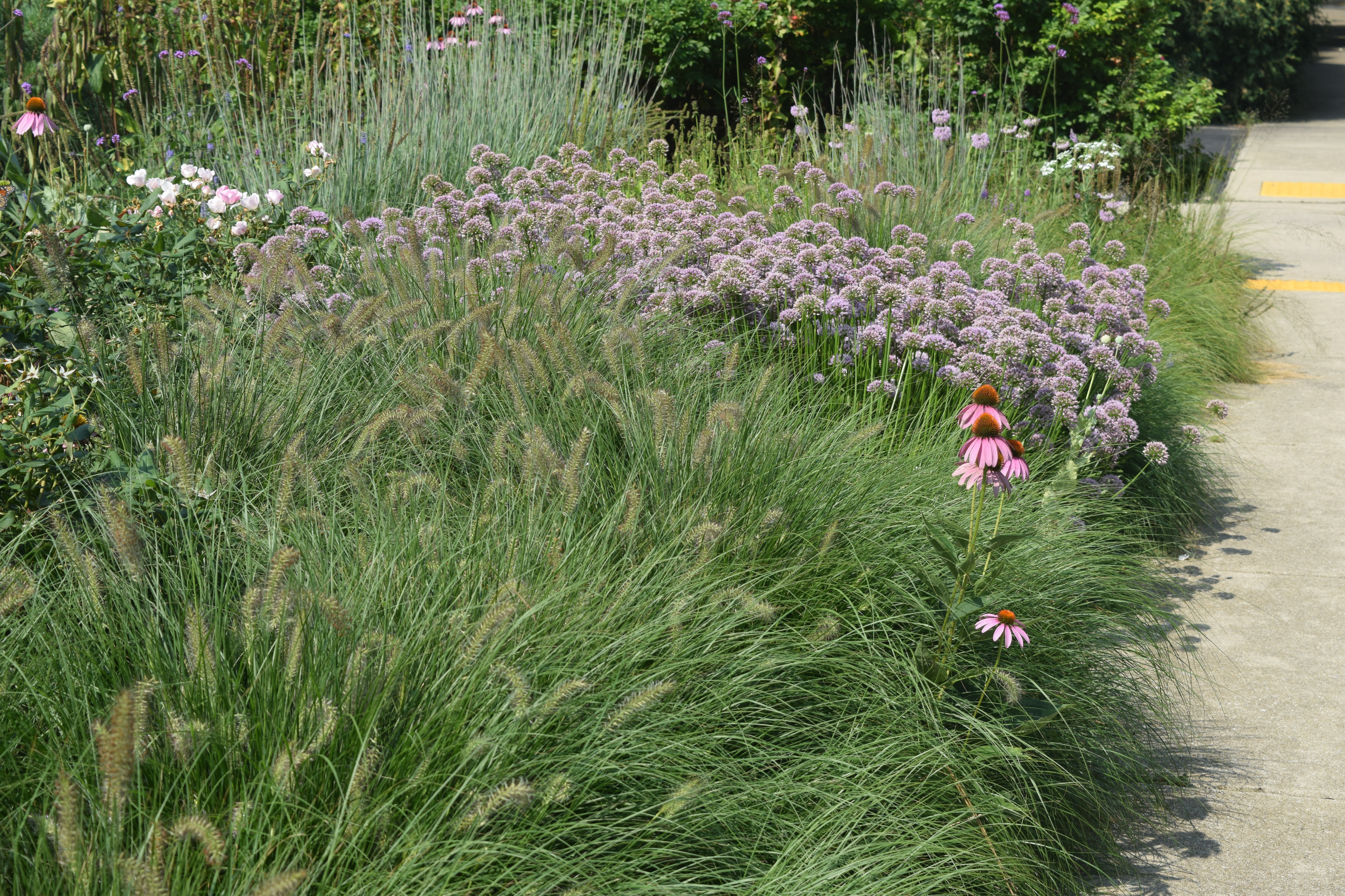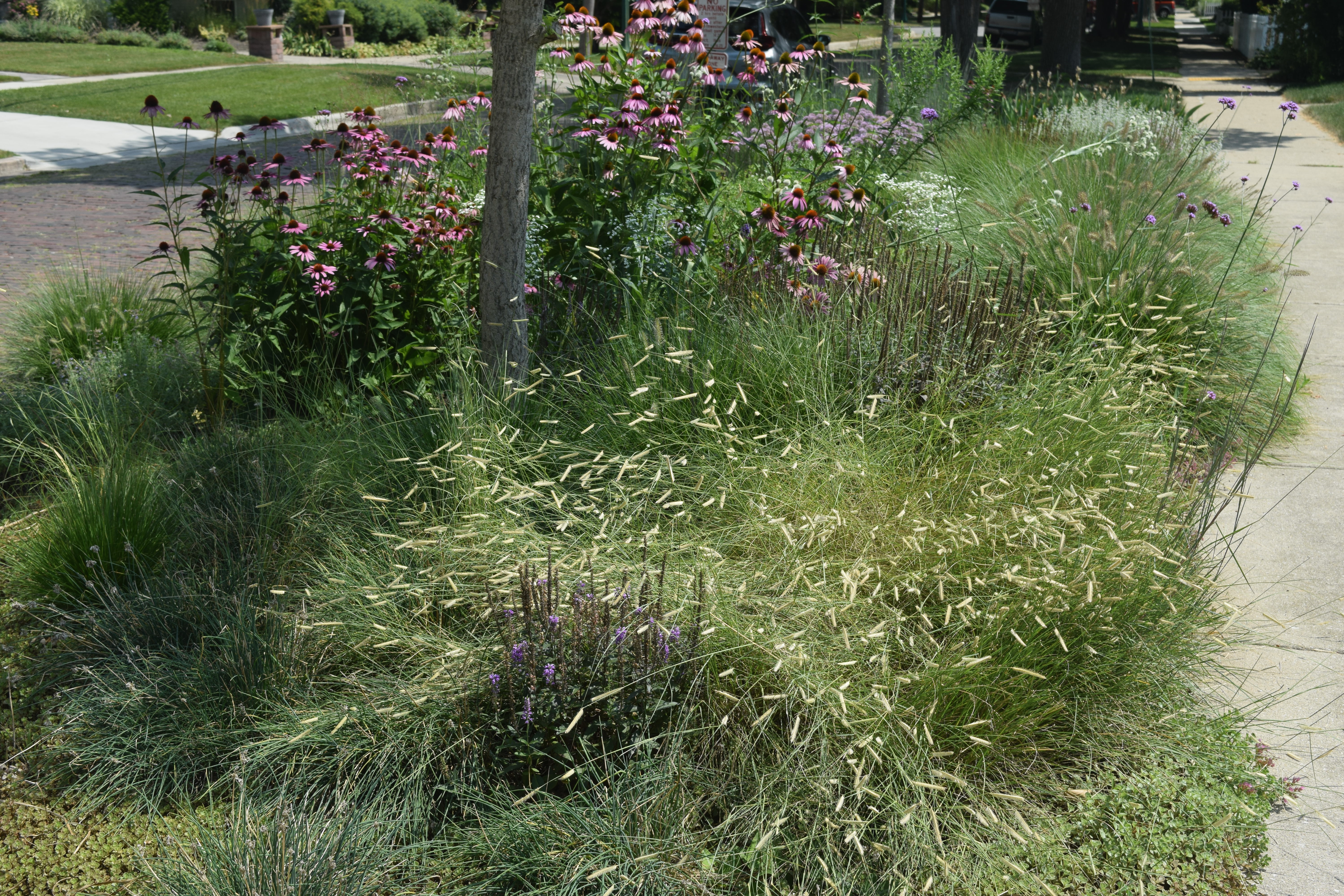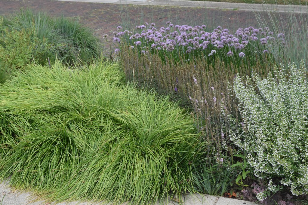 Along the sidewalk opposite the parkway, more Allium ‘Summer Beauty’, Little Bluestem, and some kind of compact Fountain Grass (Pennisetum).