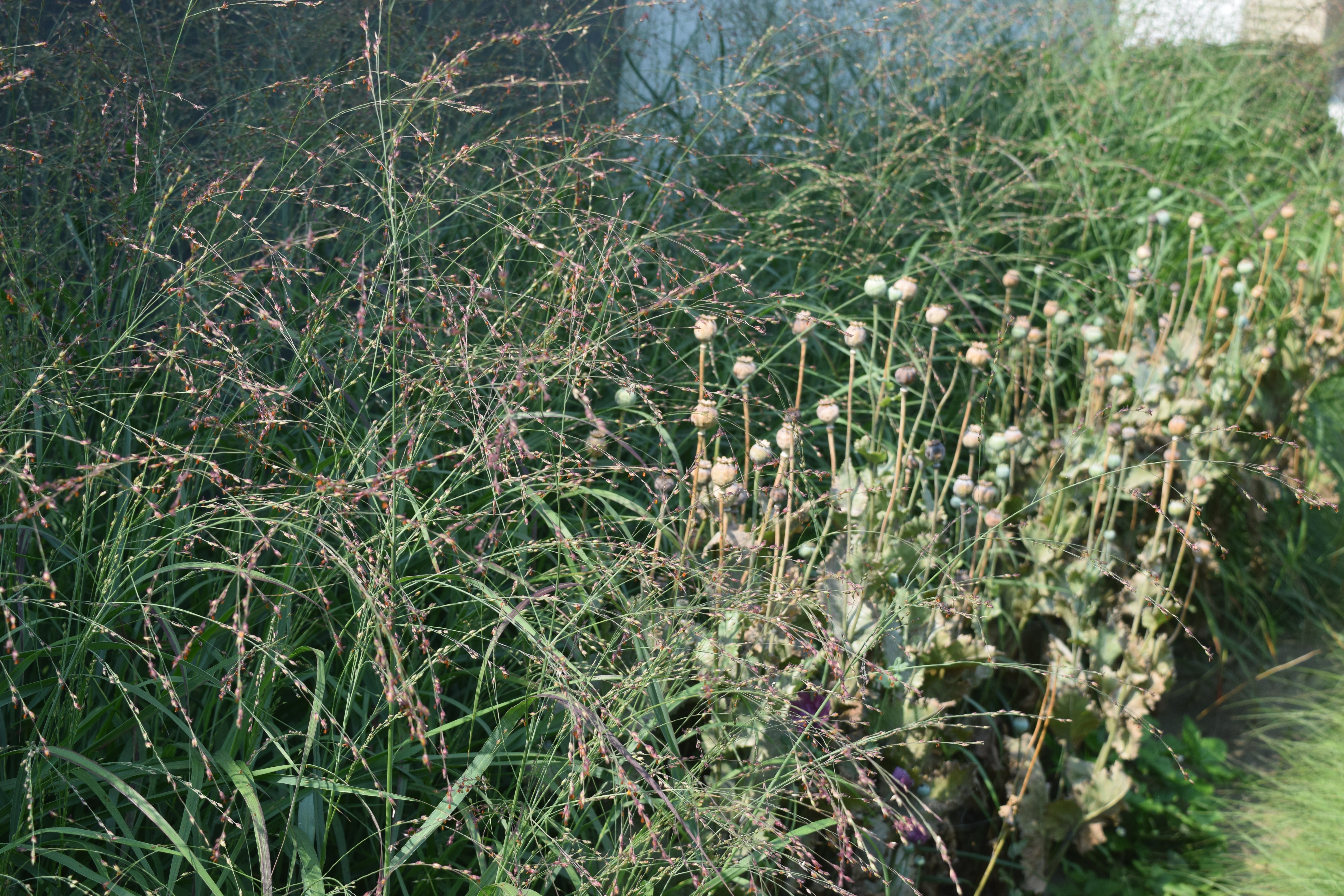 Along the front of the house, I love this mix of poppy seed heads and a compact variety of Switchgrass (Panicum virgatum).
