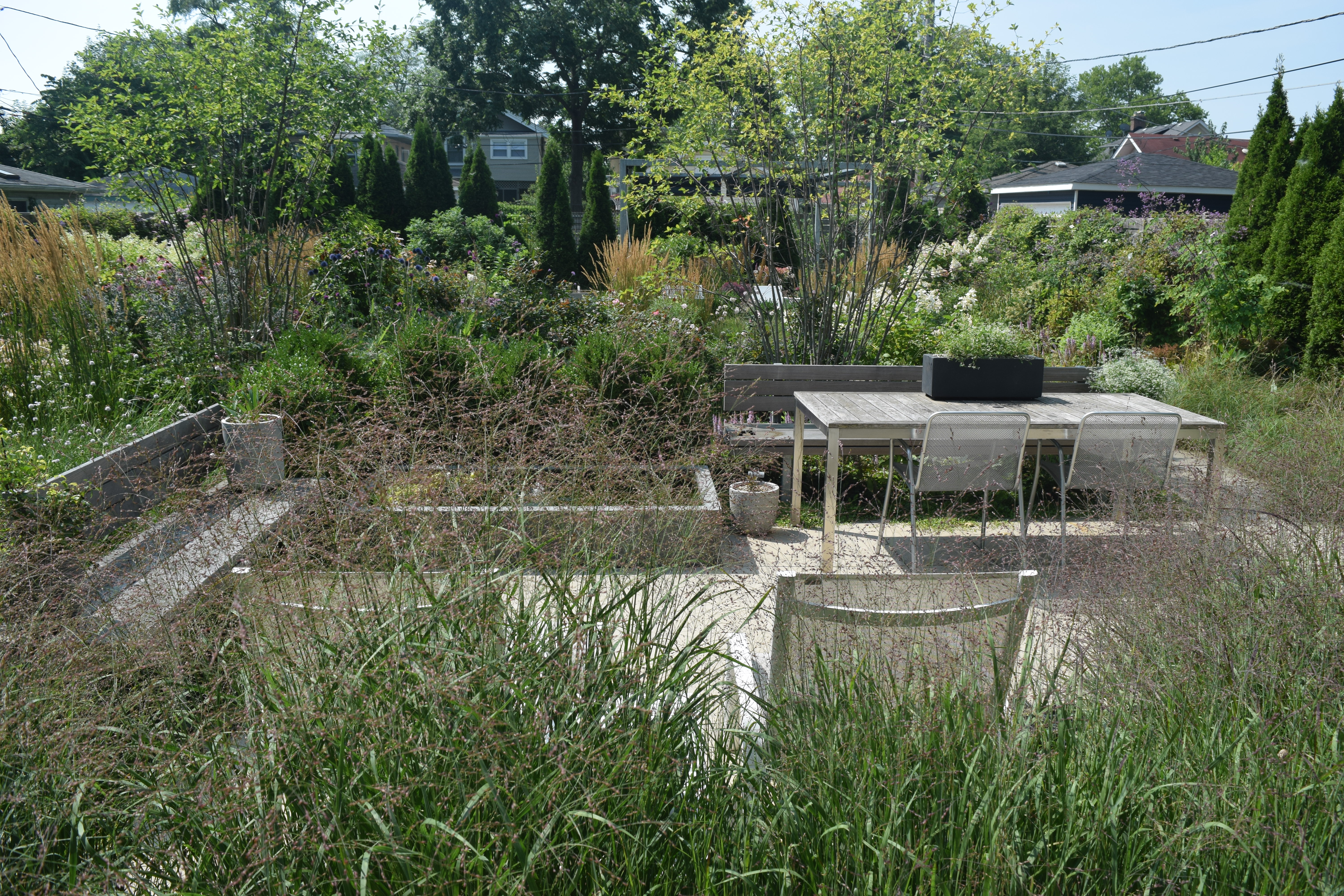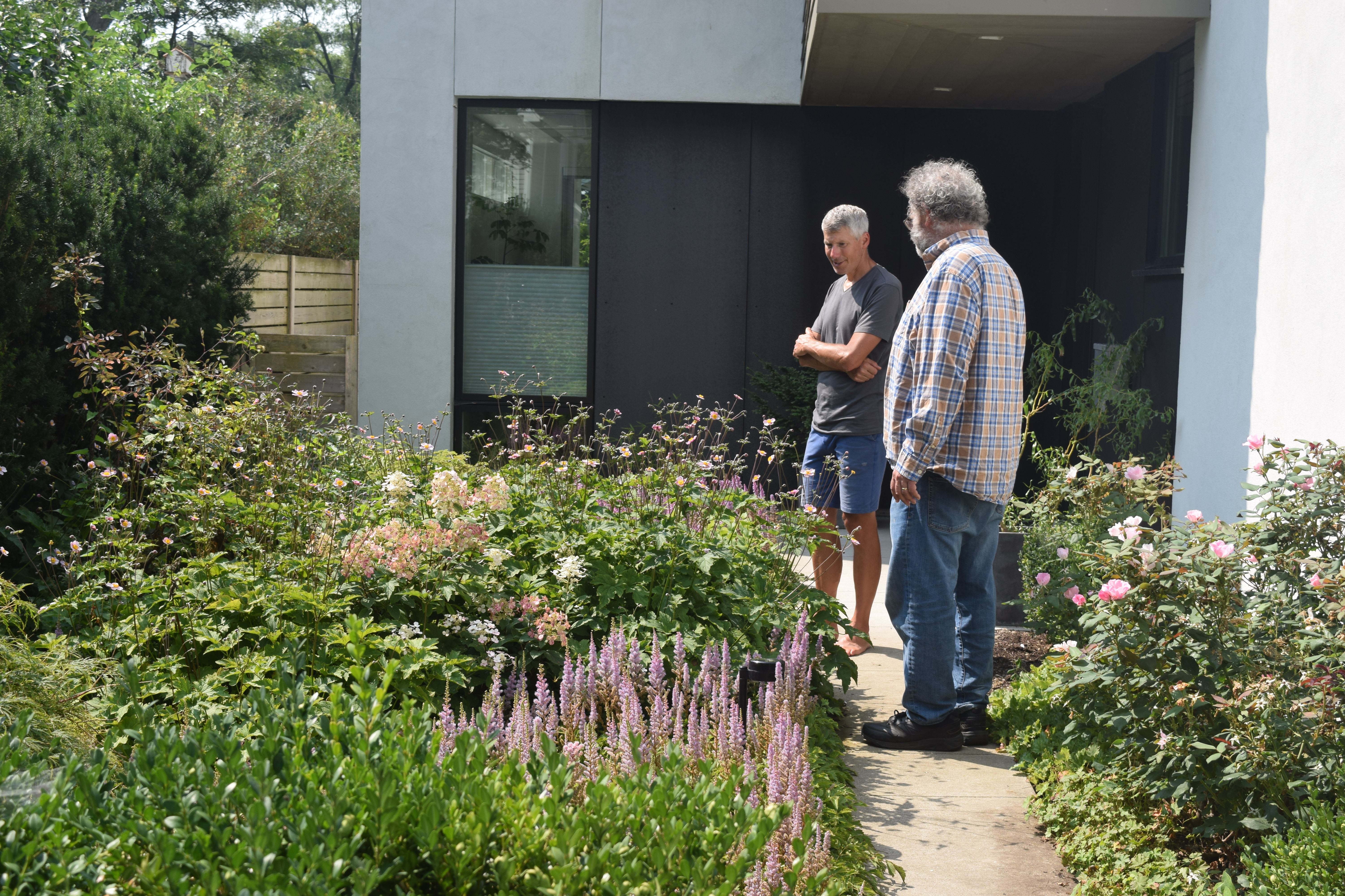 Mike, a middle school music teacher, and his spouse moved here six years ago. In the front garden, a dense mix of mostly shorter grasses and flowering perennials provides a canvas from which emerge taller perennials, roses, dwarf conifers, and Hydrangeas.
