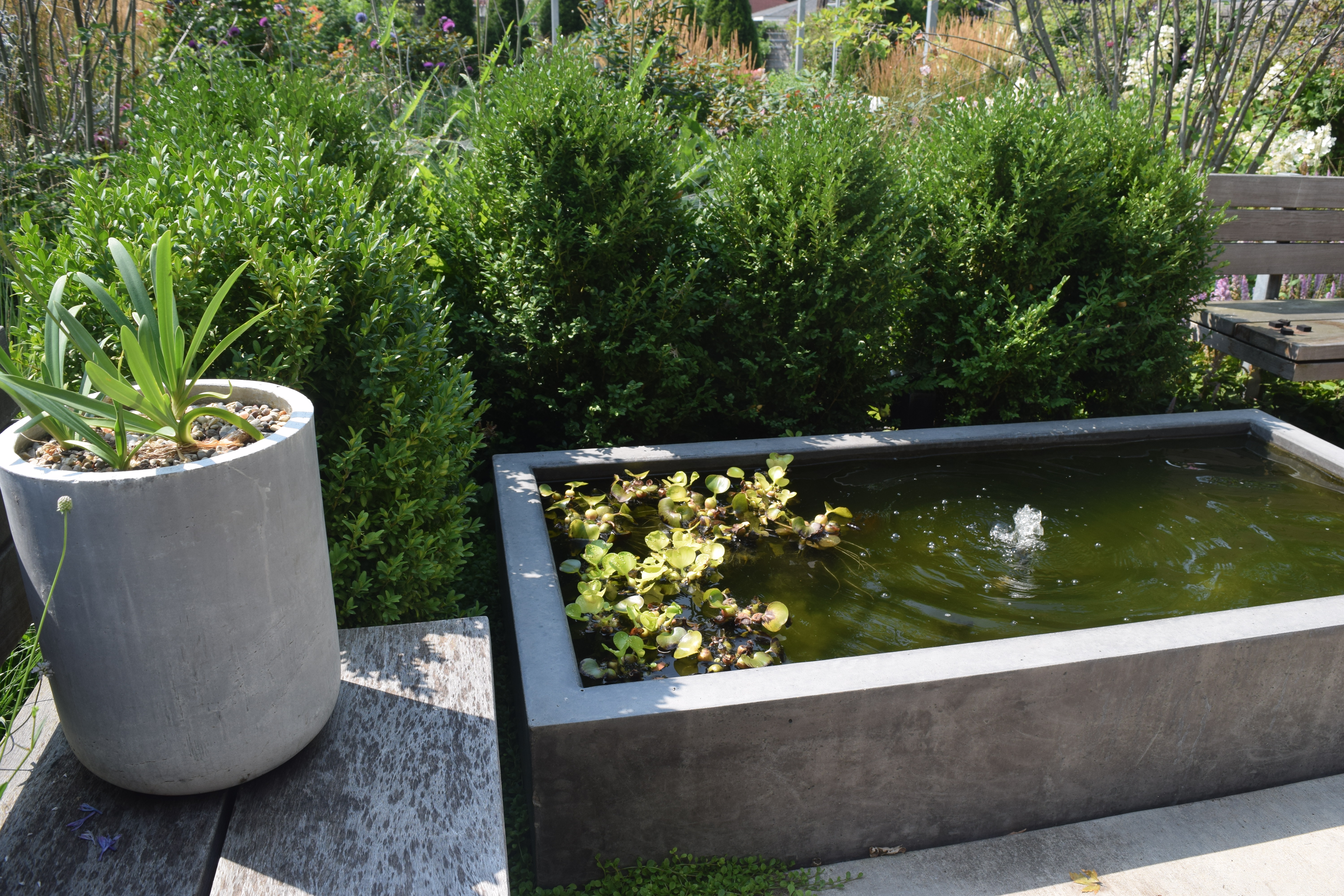 There are two water features, this small pond with goldfish, and a shallow fountain toward the back of the garden that enables songbirds to take a sip of water when they want to.