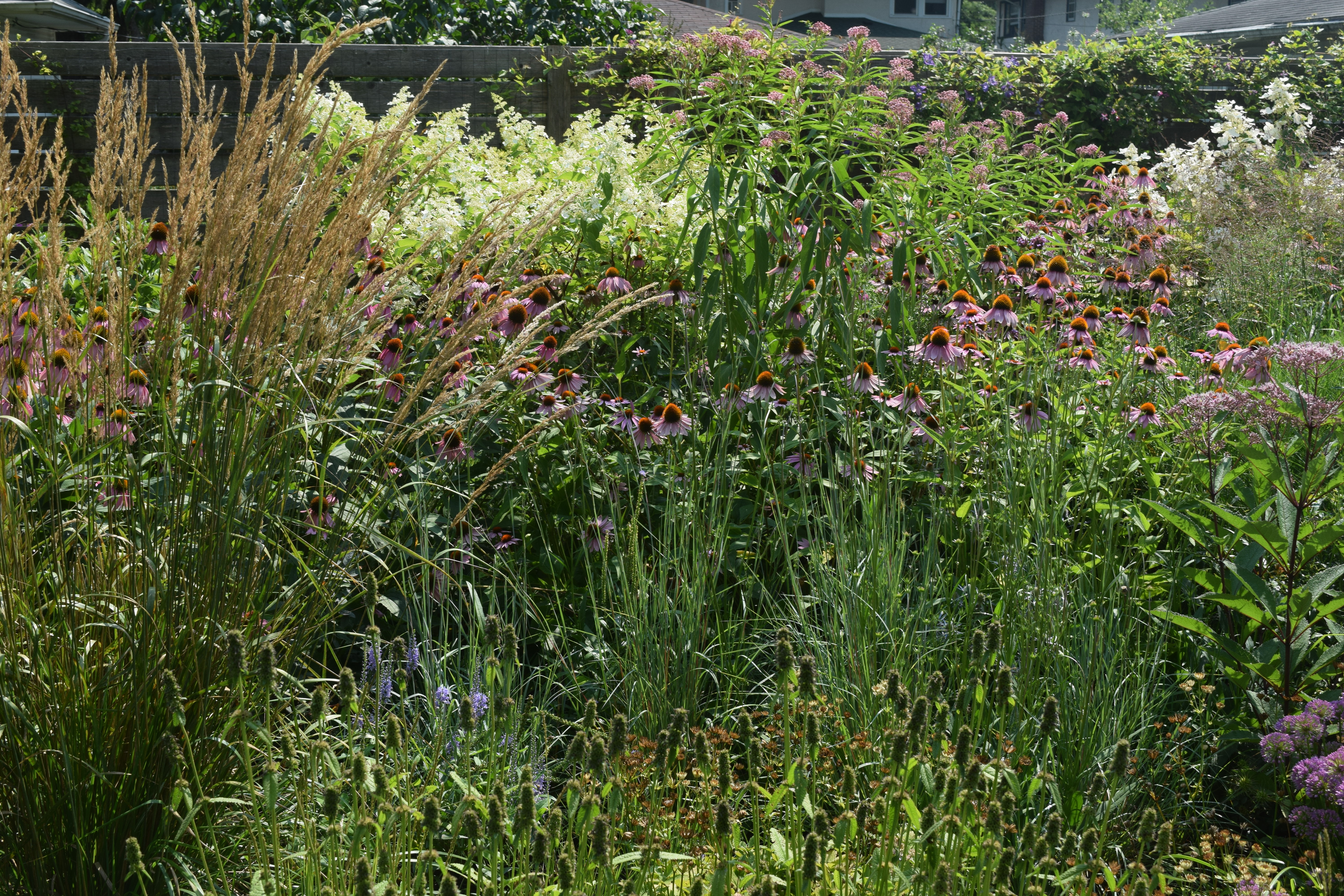 The back garden plantings have more height to them. Here you can see the Purple Coneflowers (Echinacea purpurea), ‘Karl Foerster’ Feather Reed Grass, and Swamp Milkweed (Asclepias incarnata), among other things. Mike favors softer colors – blooms of pink, purple, white, and lavender.