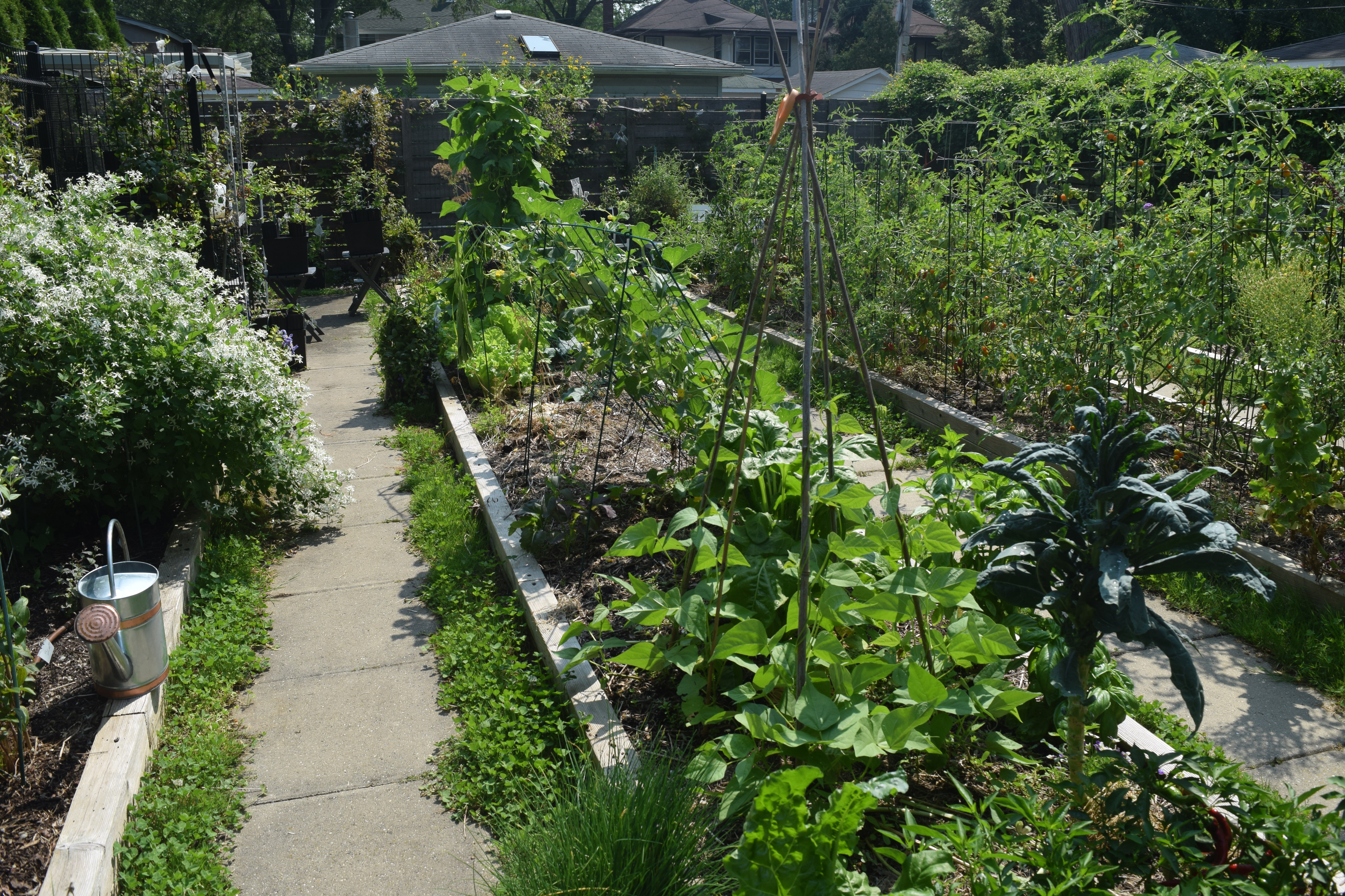 This garden is laid out on an unusually deep lot, about 50′ x 170′. Toward the far back, beyond a wooden fence dividing the yard, the last quarter or so of the space is an extensive vegetable garden.