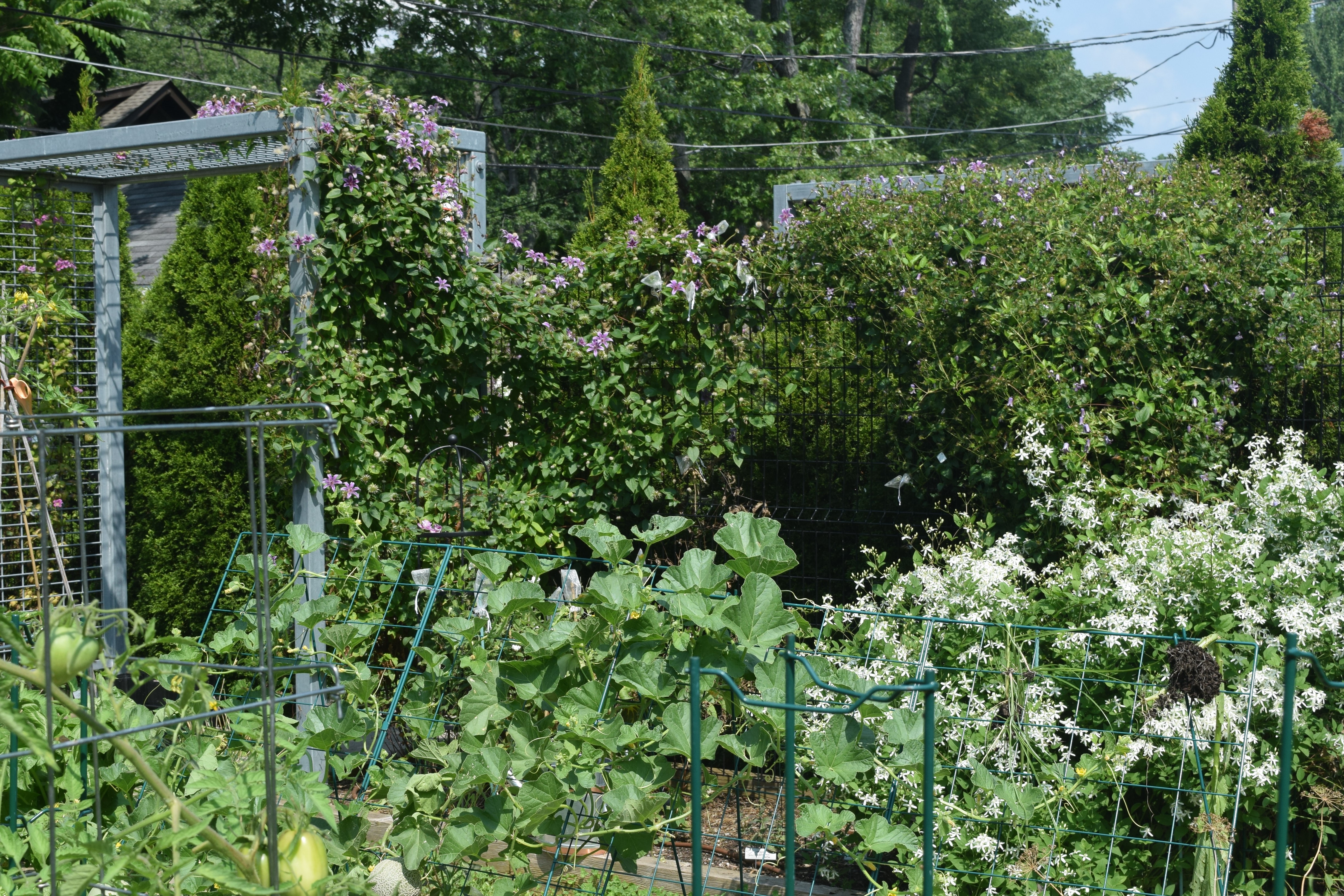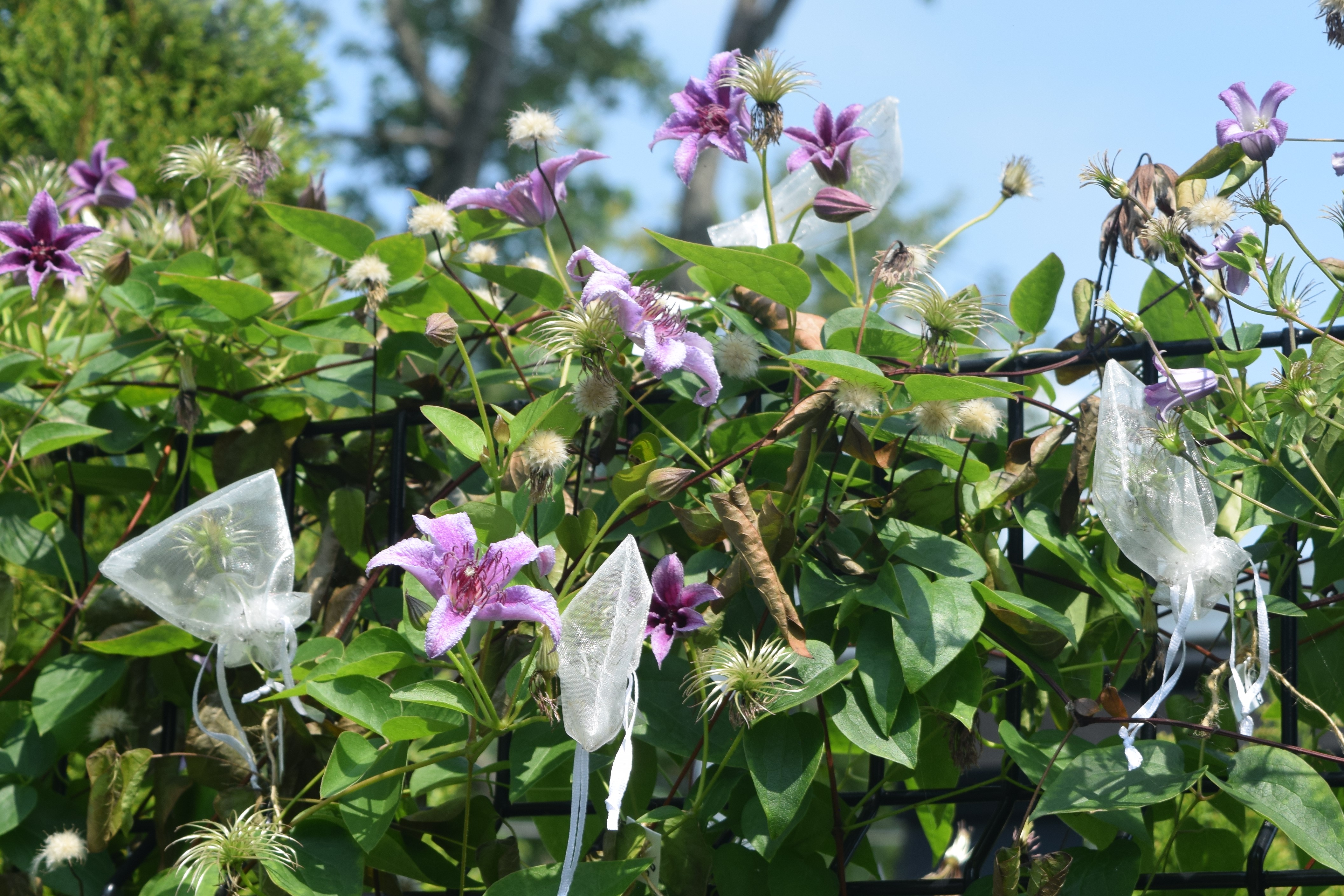 Everywhere, Clematis are trained up tomato cages, arbors, and the surrounding fences.