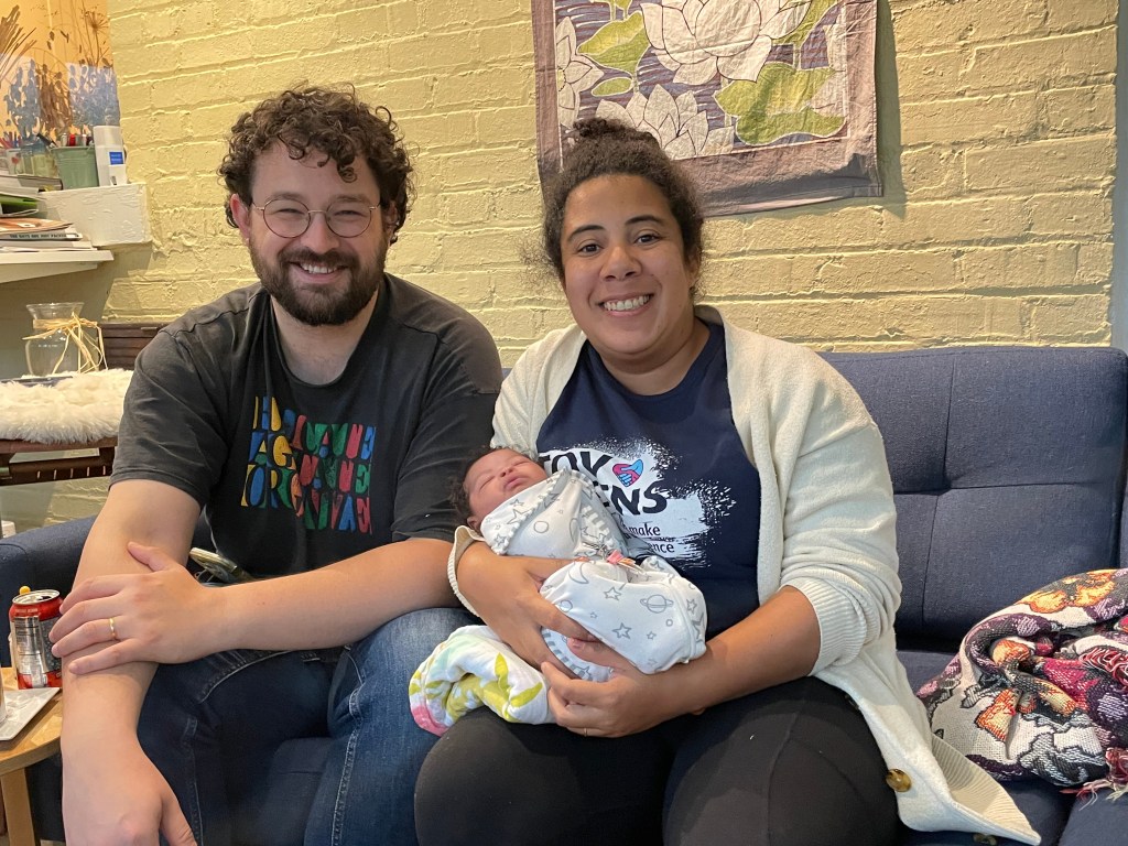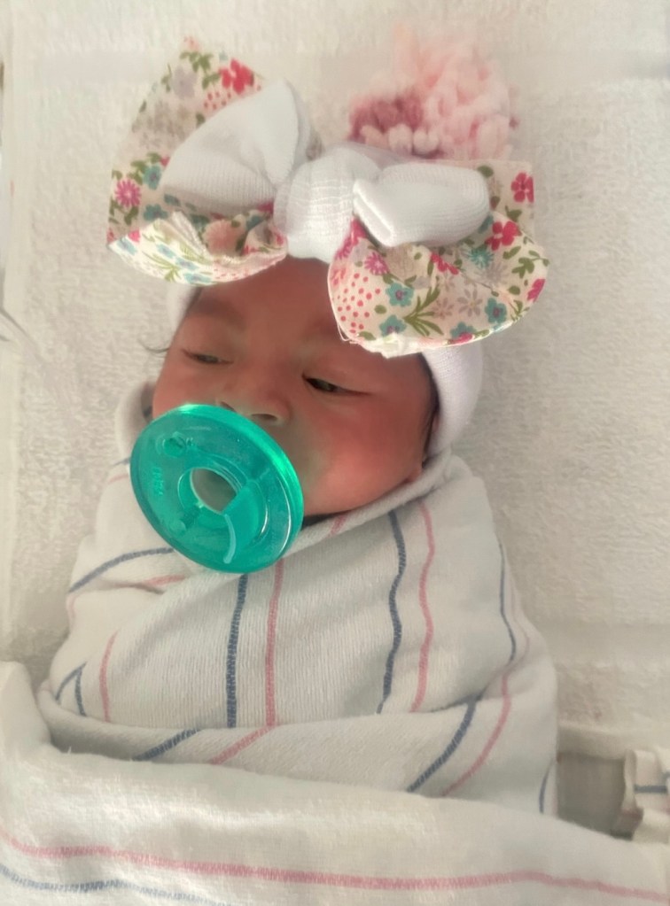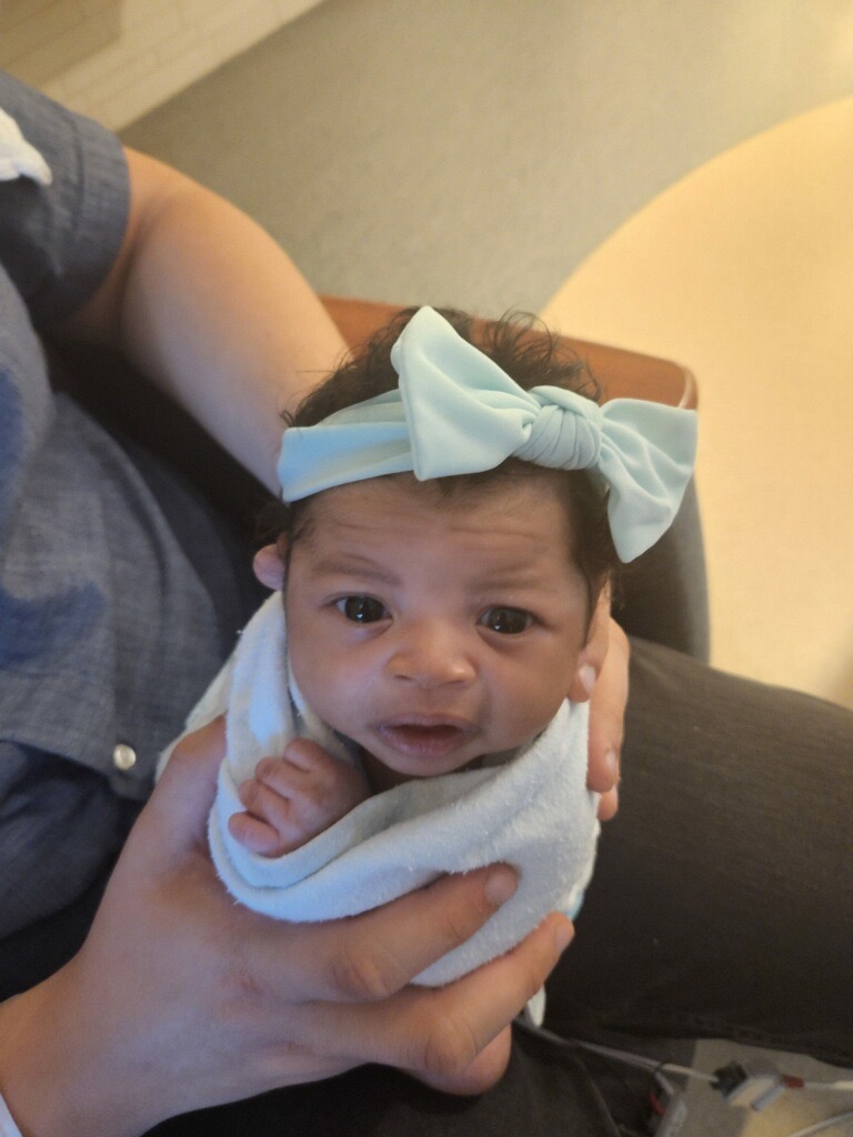 Her name is Addie, and she is seven weeks old. She is adopted from a birth mother in Florida. New parents Daniel and Beckee spent three weeks in Tampa while Addie did a bit of growing in the NICU. We are so glad they are all home and doing well now!