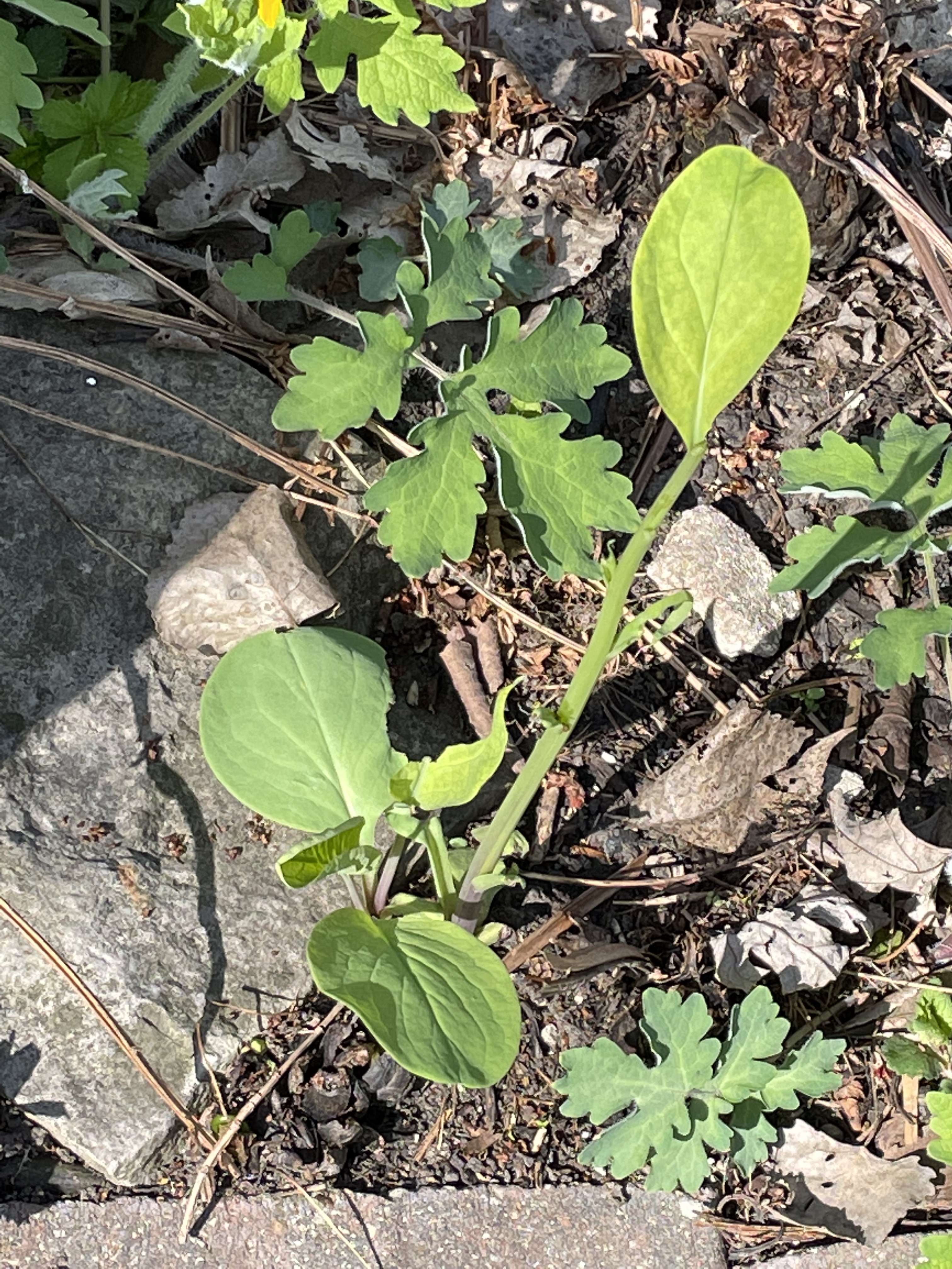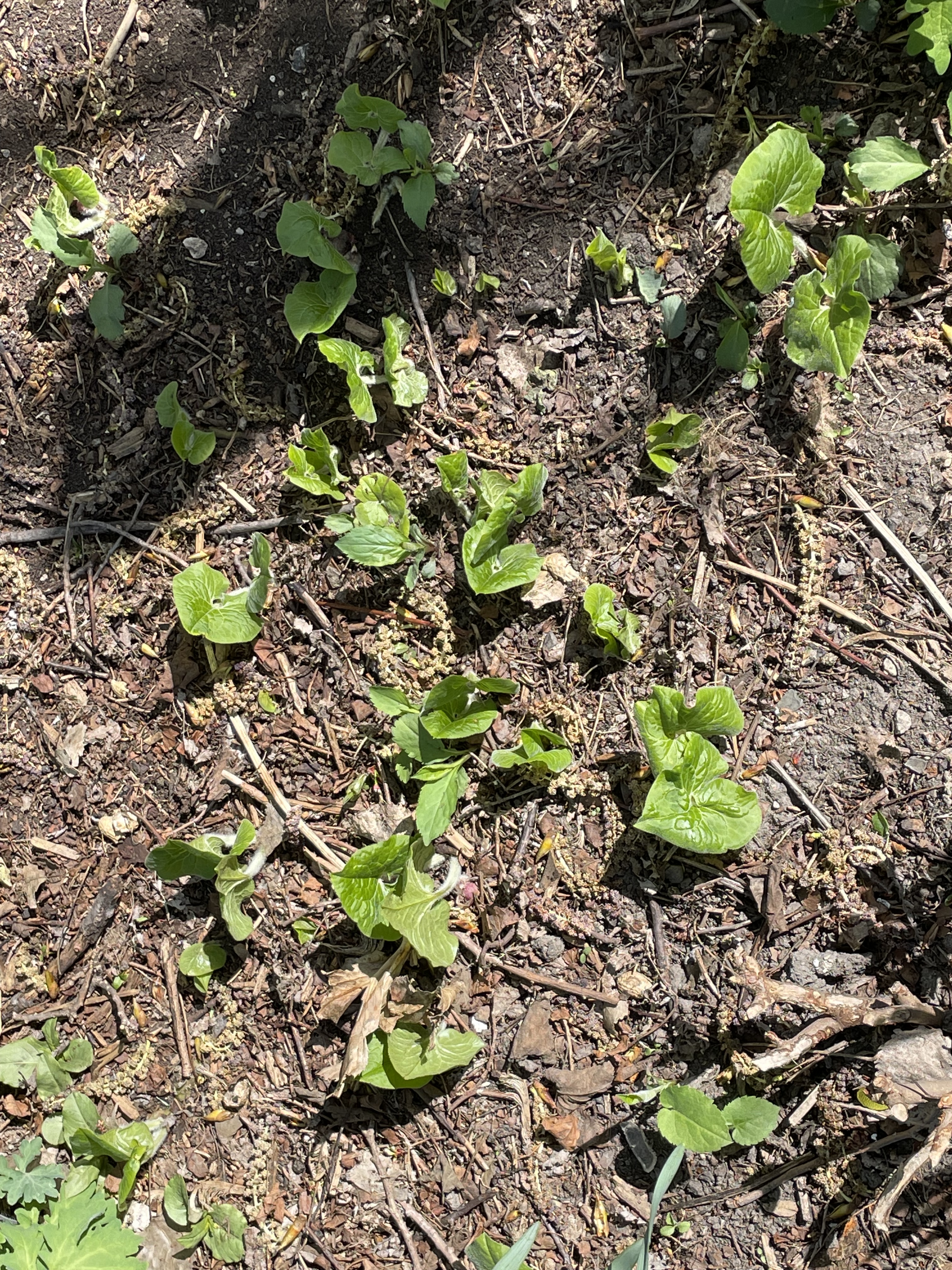 First, the bloodroot, which I am trying to watch closely — it has a way of blooming one day and being gone the next, and I don’t want to miss it! (It’s also possible that this is just wild ginger, and that the bloodroot has died out — I hope not!! Feel free to offer opinions in the comments.)