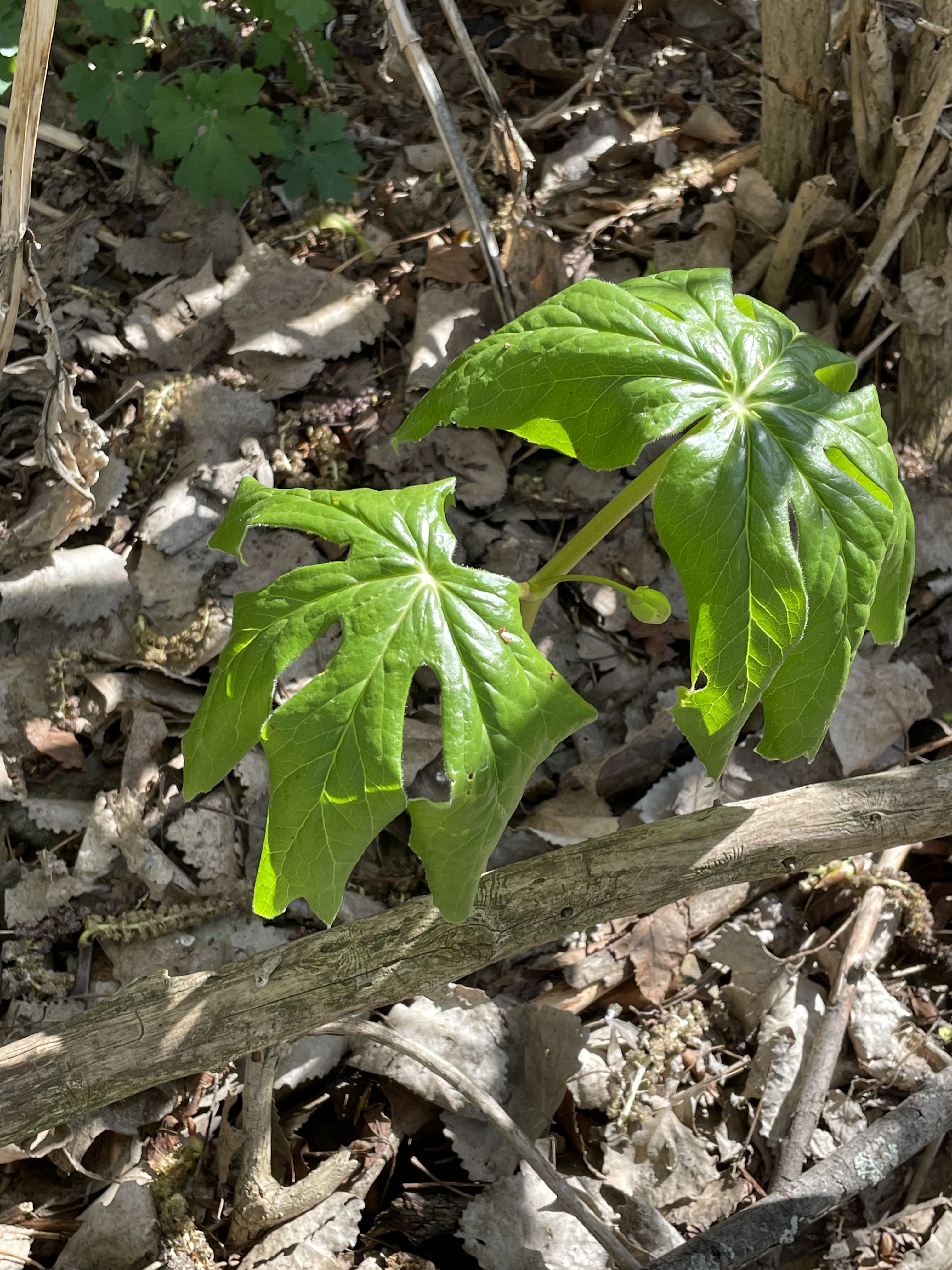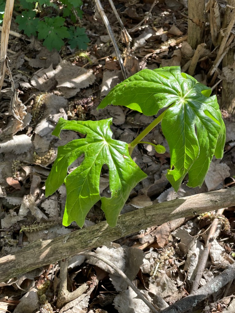 Here is one of the May Apples. I love the spring ephemerals, but you really have to watch them, or they’re gone before you know it. You can see the bud; it’s hiding below the leaves to make it even easier to miss.