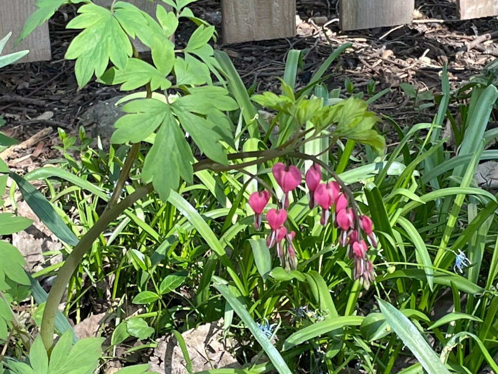 We used to have a lot more Bleeding Heart. It’s one of those flowers I didn’t think I was going to like (too pink!) and then fell completely in love with. I have made a note that we need to plant more. It’s especially lovely combined with Virginia bluebells and ferns (although the Ostrich ferns in the front window bed are just barely starting to come up, see photo below in the collage).