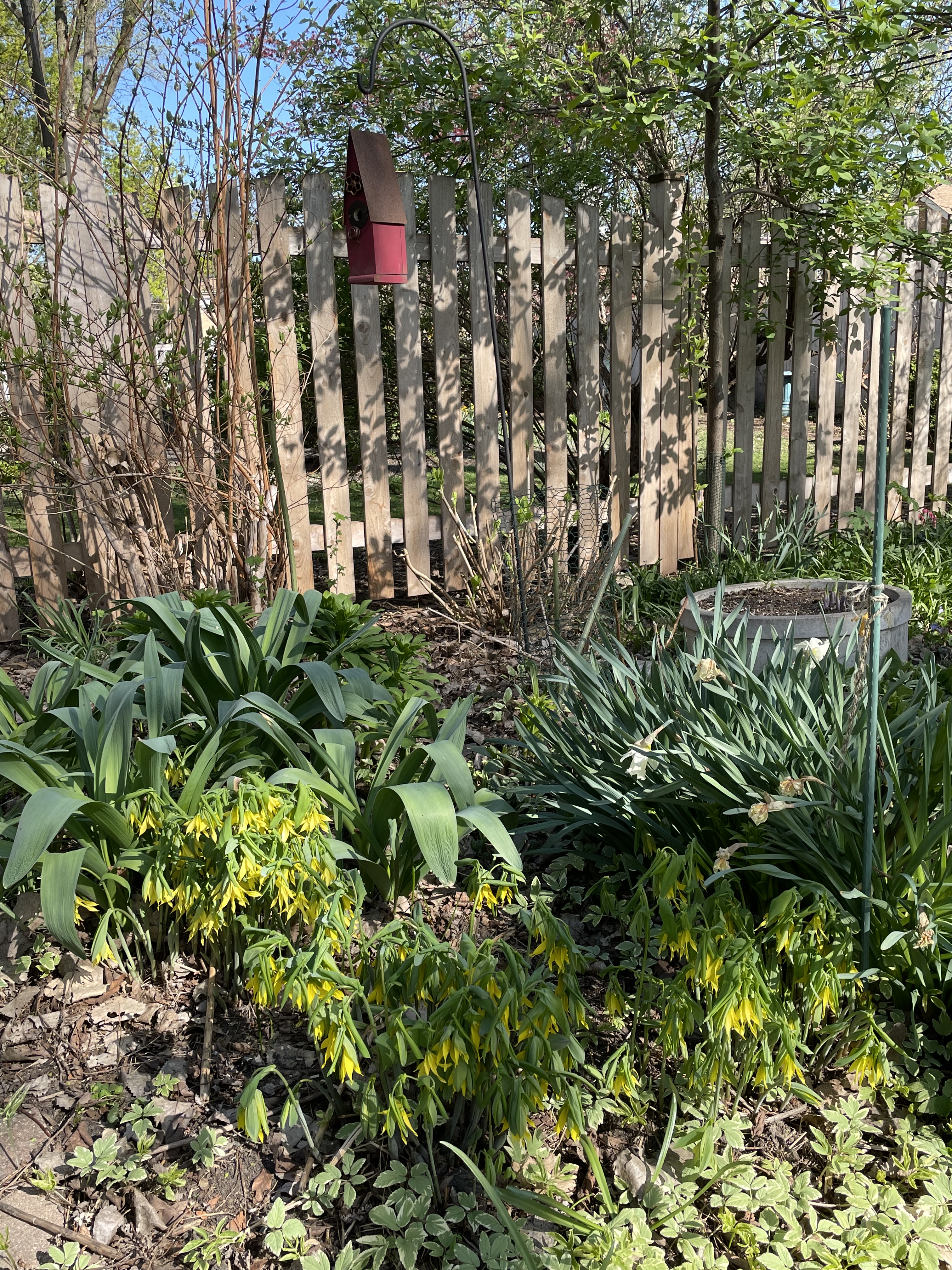 The yellow flowers below are uvularia. We discovered them when we briefly lived in Madison, Wisconsin, in a house whose border garden had been allowed to go wild, next to a woodlot with lots of natives. When we moved to our current house, 20 years ago, uvularia was not common in plant catalogues, but Jason found some. The main planting is on the west side of the house, where it gets less sun, and is still just opening. (Don’t you love the red birdhouse, it turns any plants nearby into a lovely vignette.)