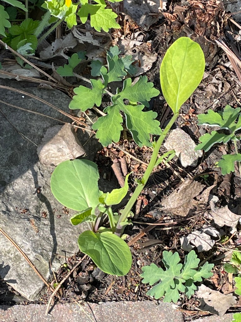 This corner, which a month ago was filled with snowdrops, continues to make me smile. Celandine poppies, witch hazel, moss. Leaves at lower left will burst with allium in May.