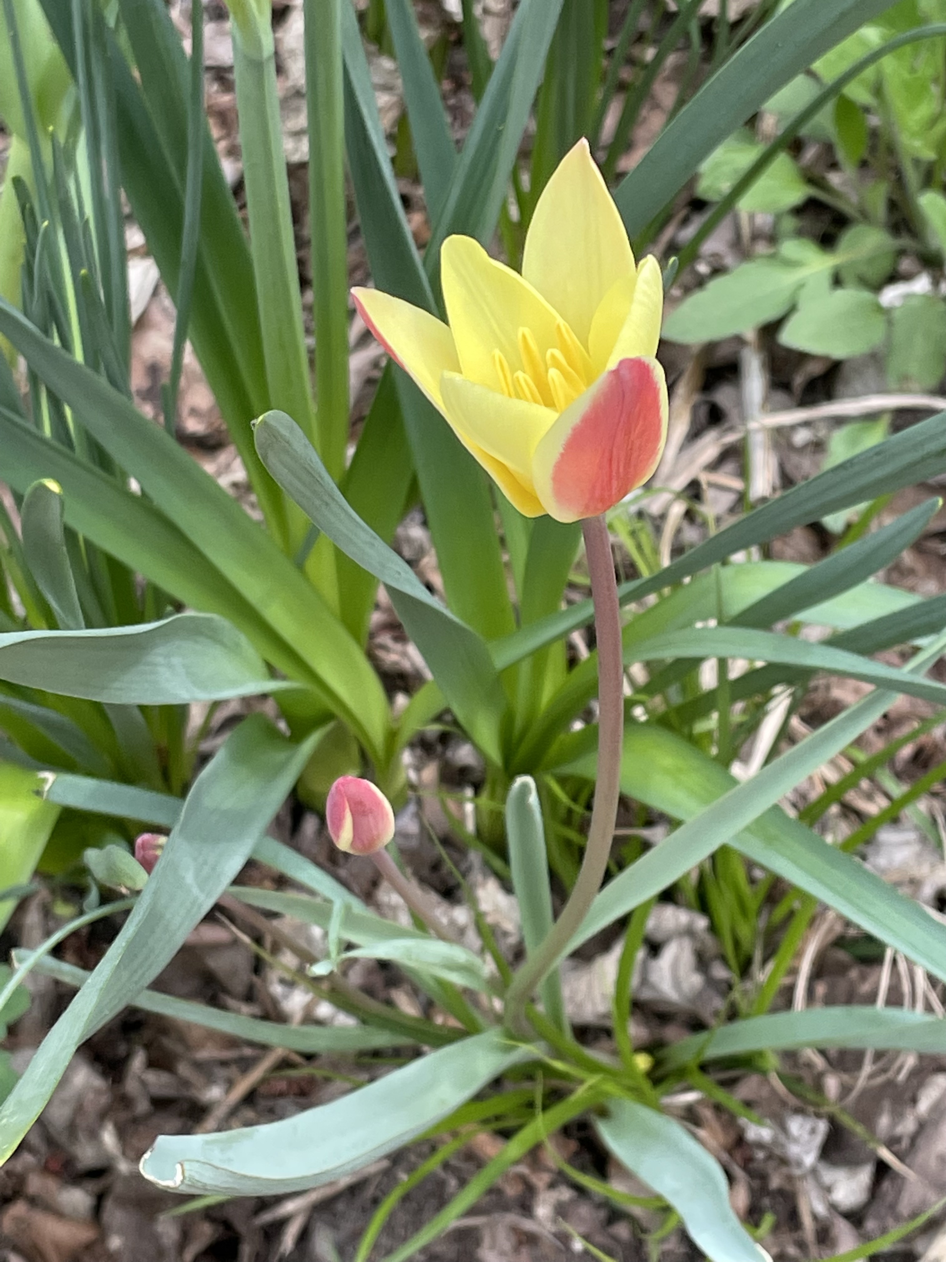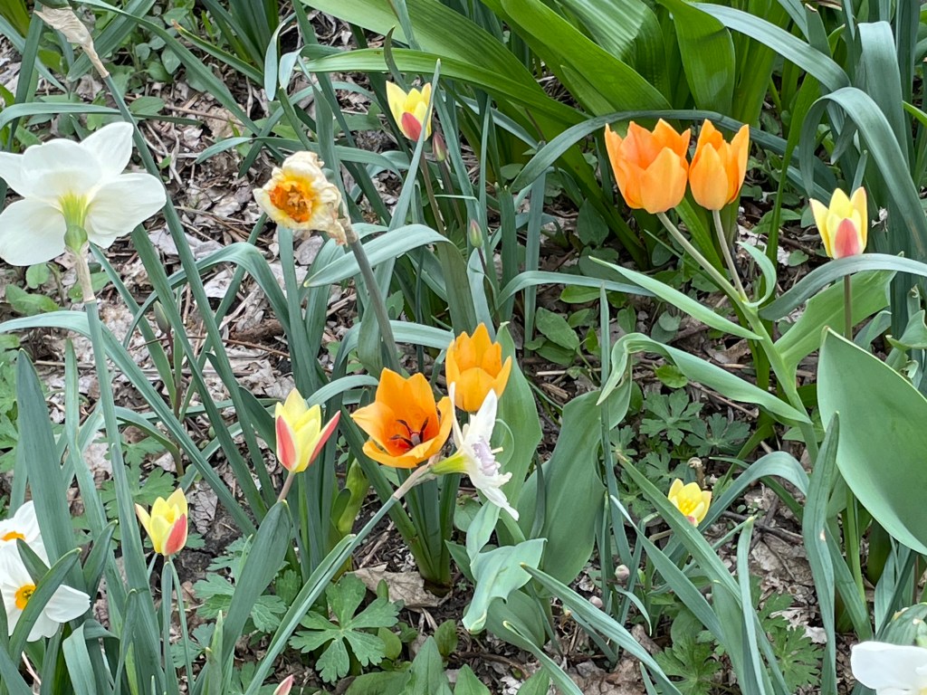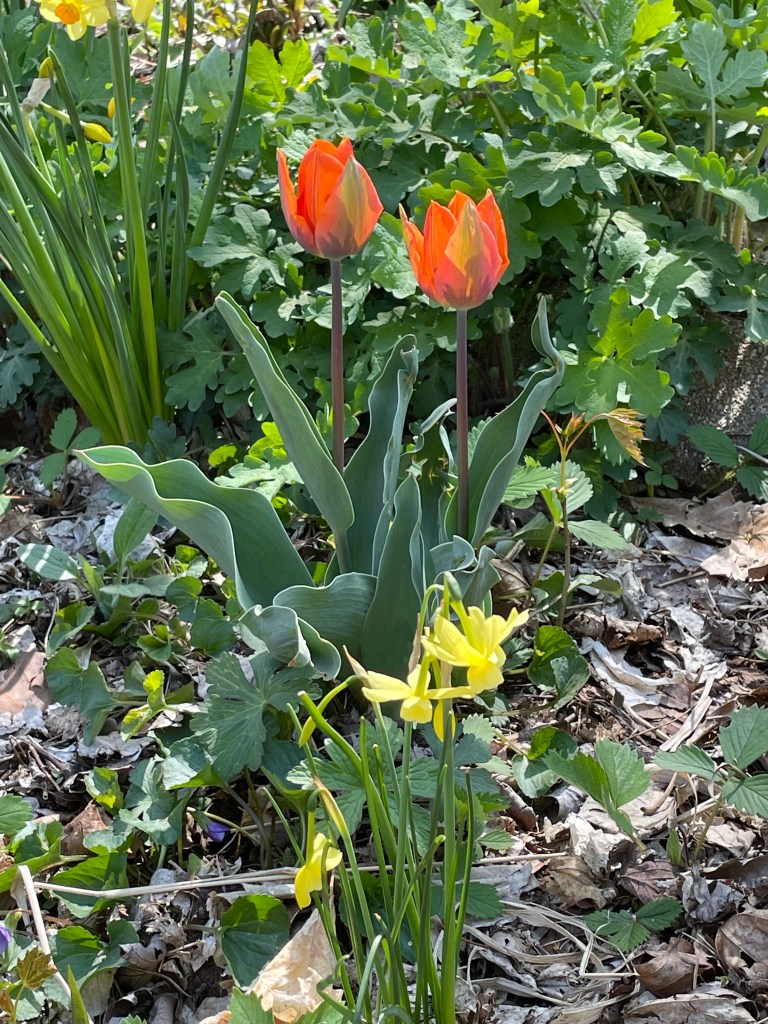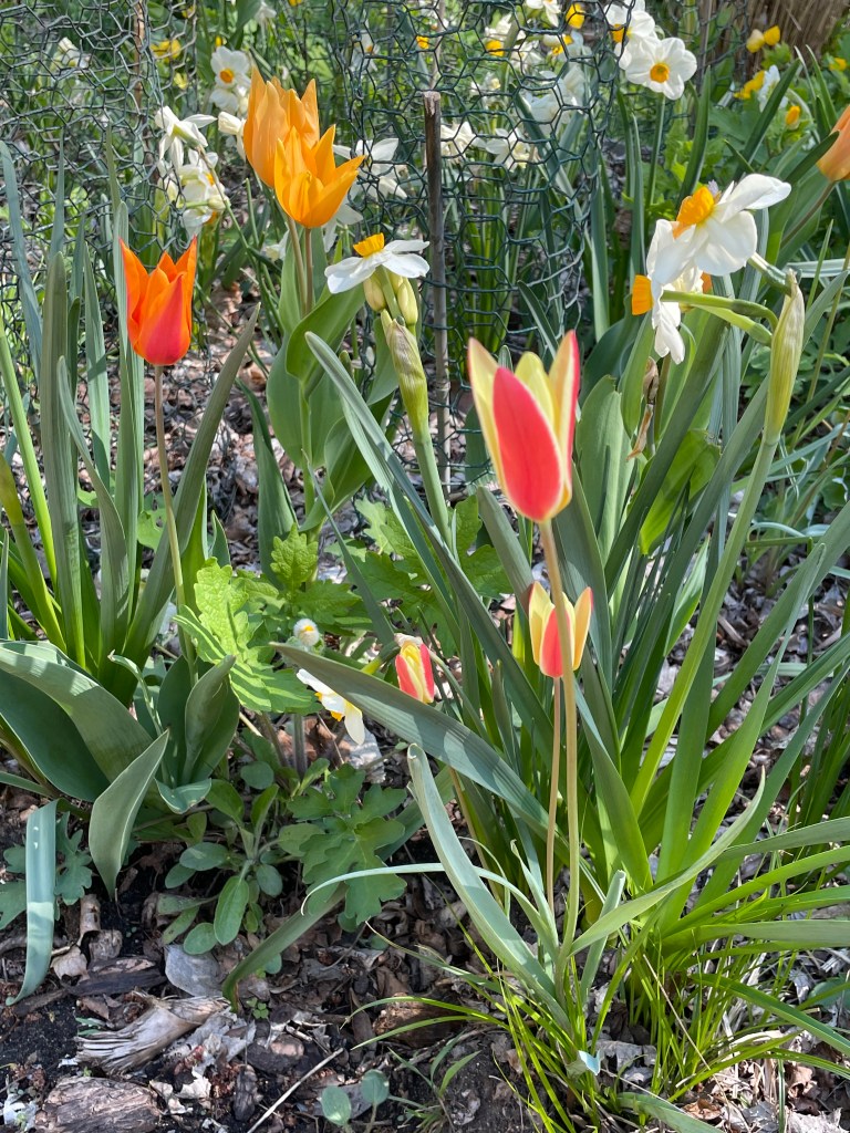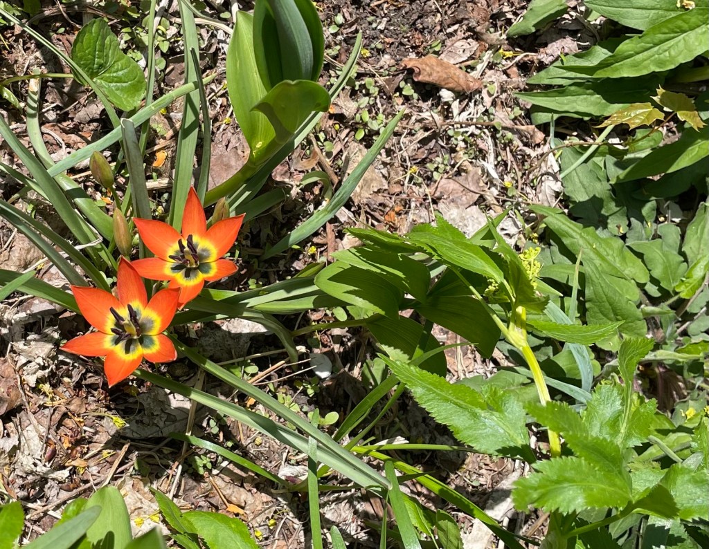 Species tulips are the original plants native to Turkey and areas to the east of Turkey, in contrast to the giant, hybrid tulips that are more common. They are supposed to be more reliably perennial than hybrids (mostly true here) and to spread (some do, some don’t). I’m very happy with a mix, in which the hybrid tulips are bold accents in a sea of species tulips.