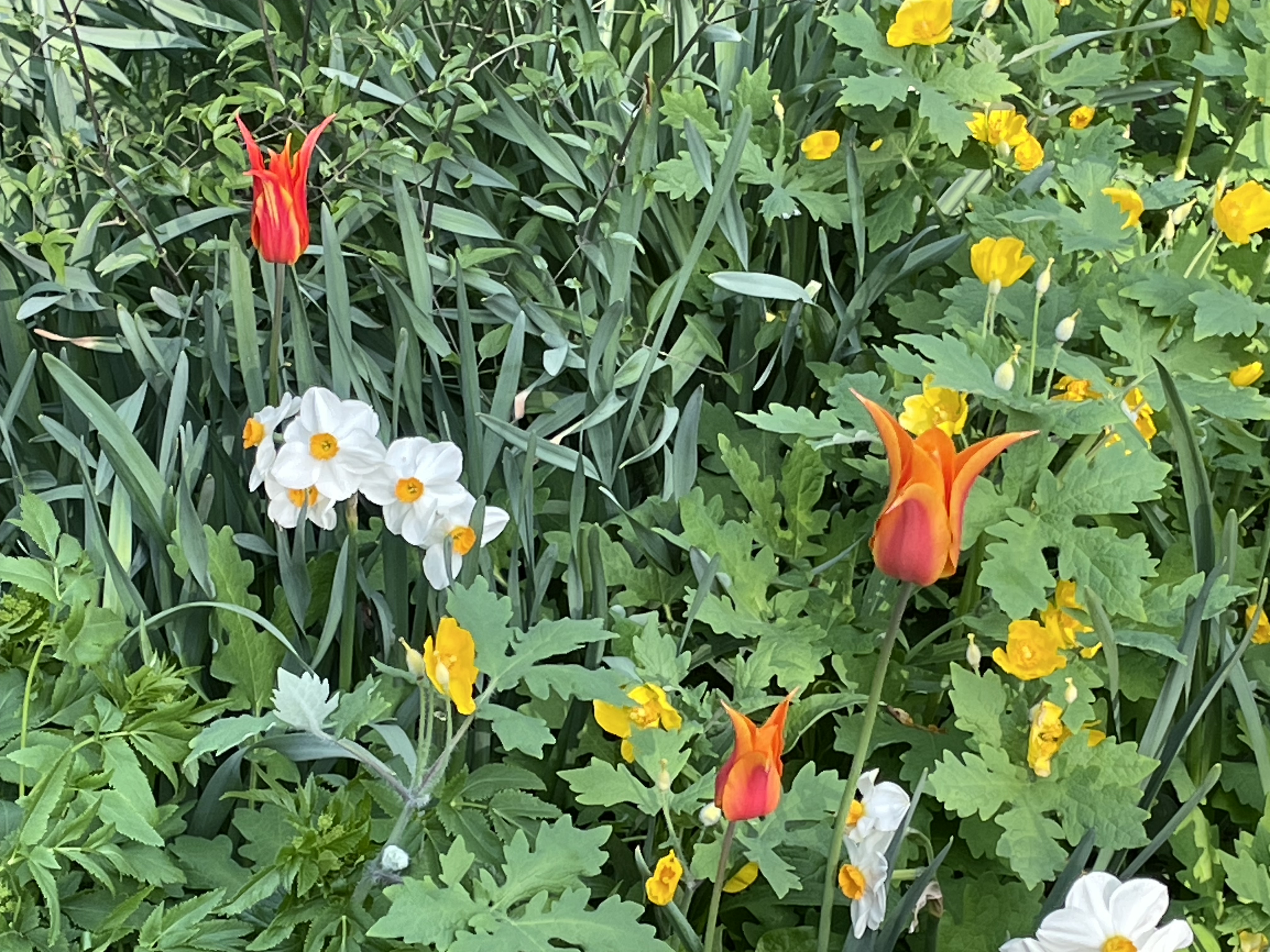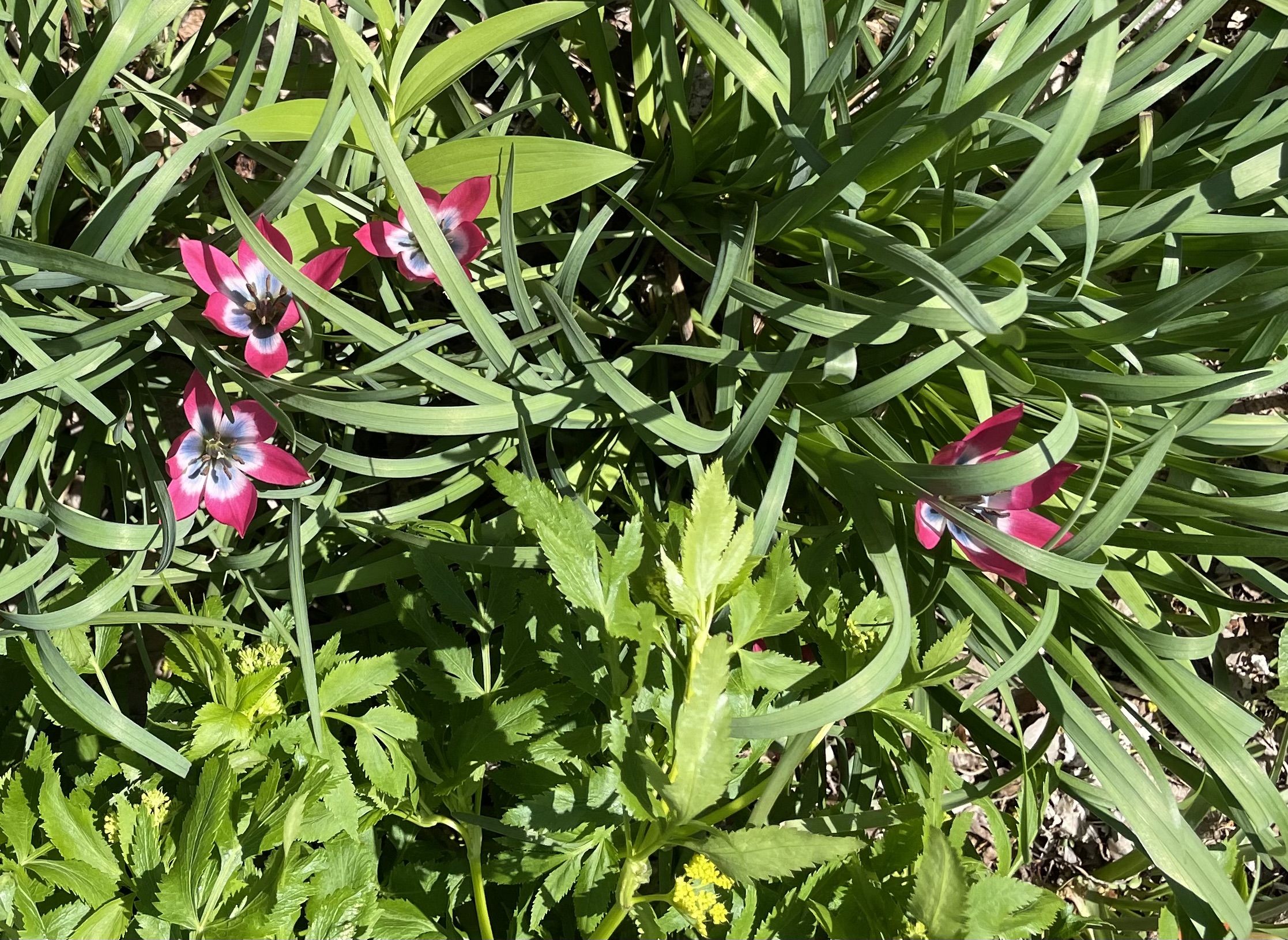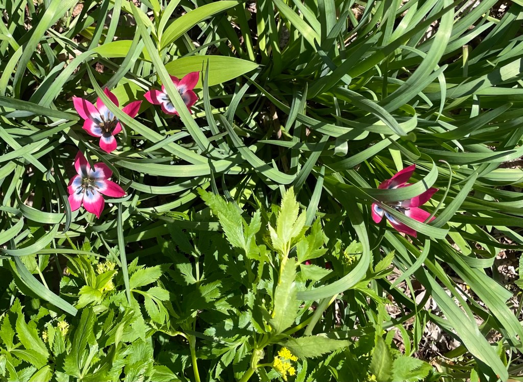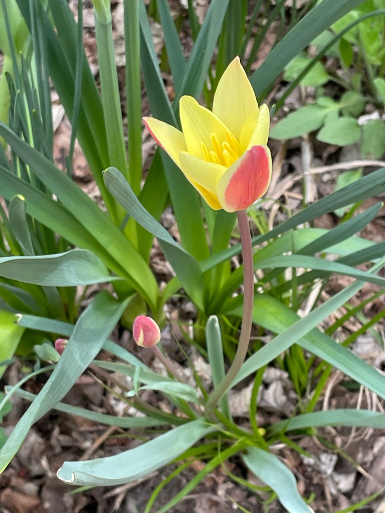 Species tulips are the original plants native to Turkey and areas to the east of Turkey, in contrast to the giant, hybrid tulips that are more common. They are supposed to be more reliably perennial than hybrids (mostly true here) and to spread (some do, some don’t). I’m very happy with a mix, in which the hybrid tulips are bold accents in a sea of species tulips.