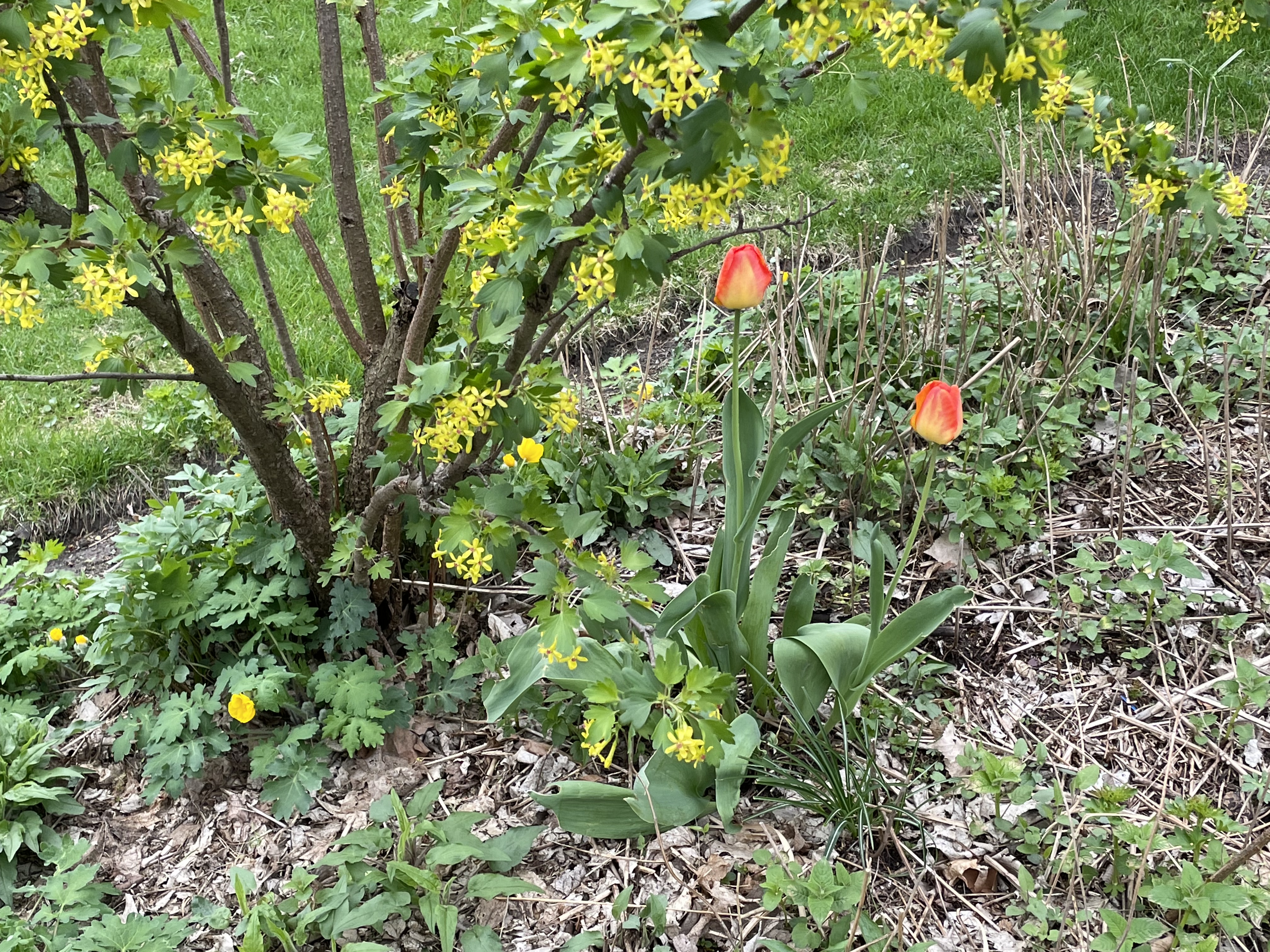 It’s a graceful vase-shaped bush, due to good pruning, but I needed you to see these tulips.