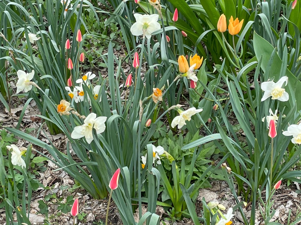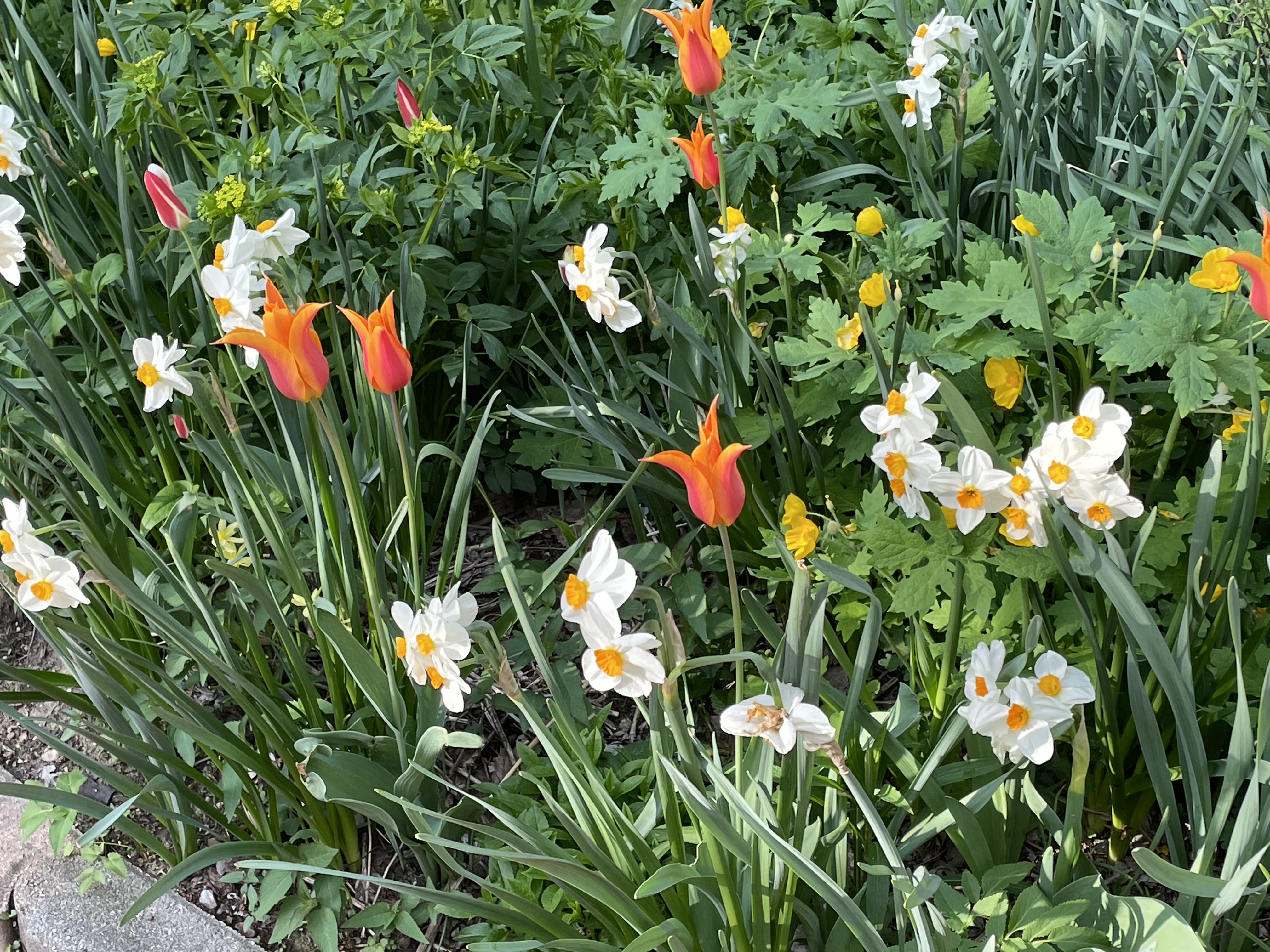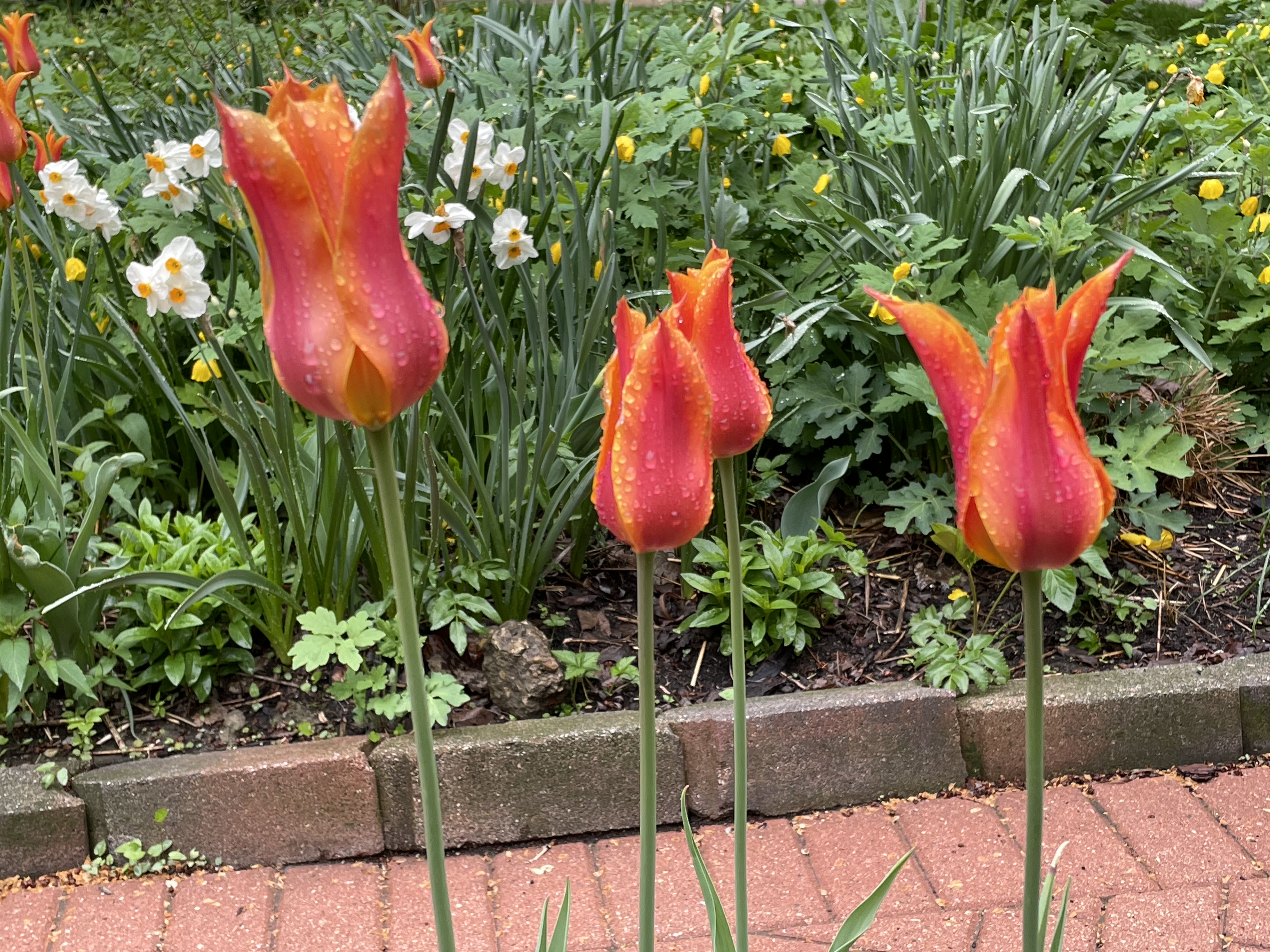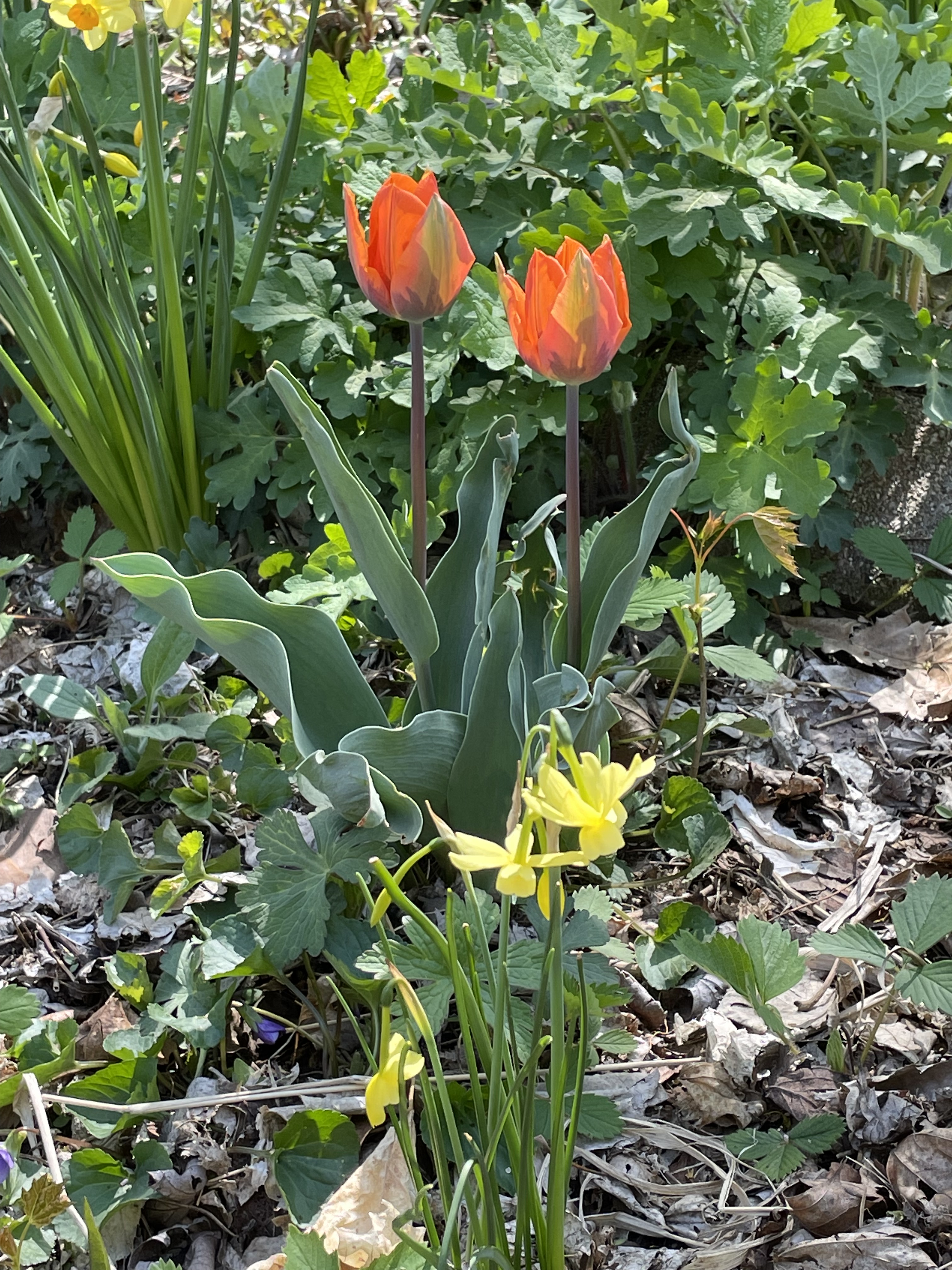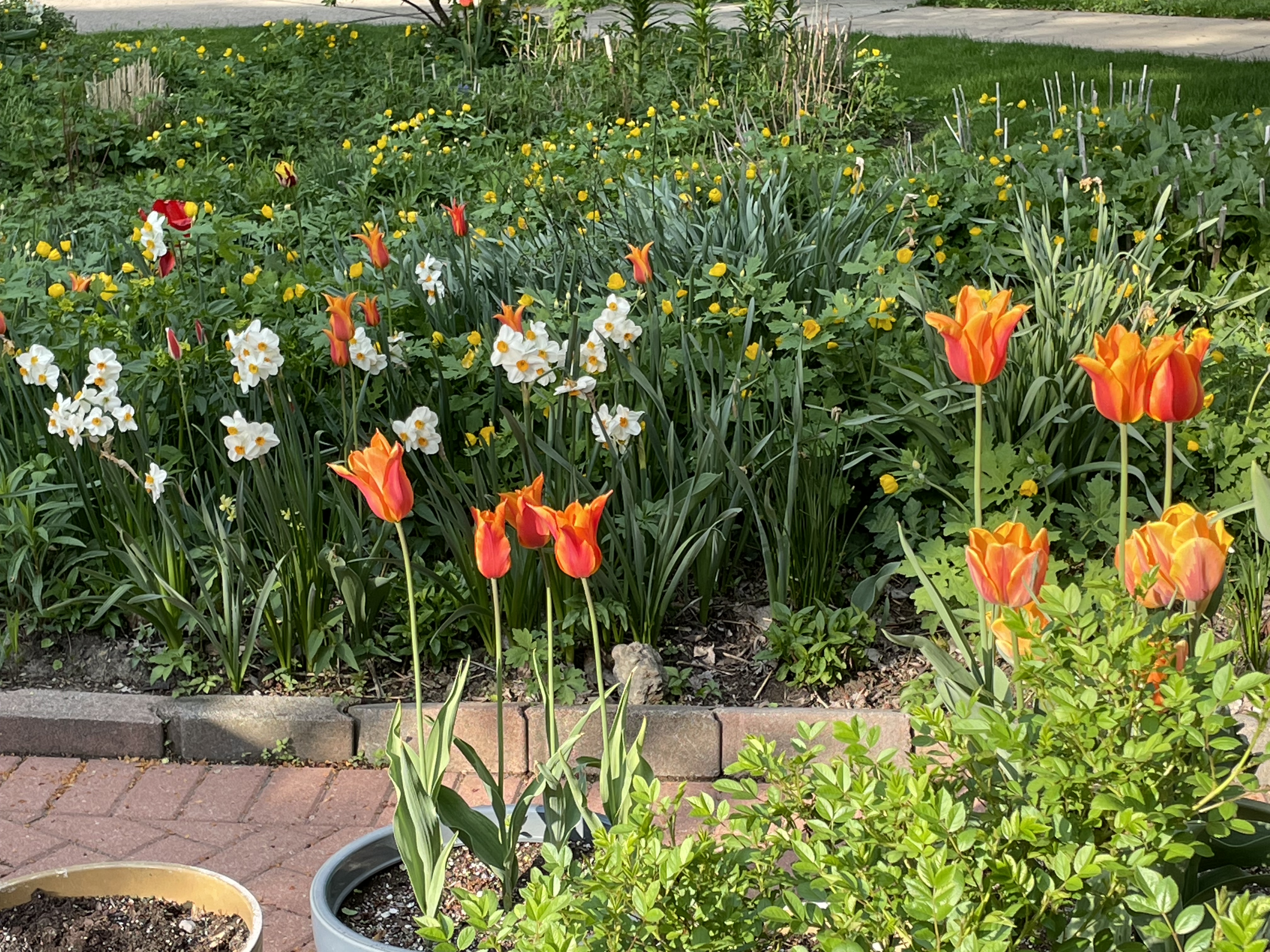 I’ll end with tulips in pots — reasonably successful this year, not spectacular — and Princess Irene tulips with some tiny multiple warhead daffodils.