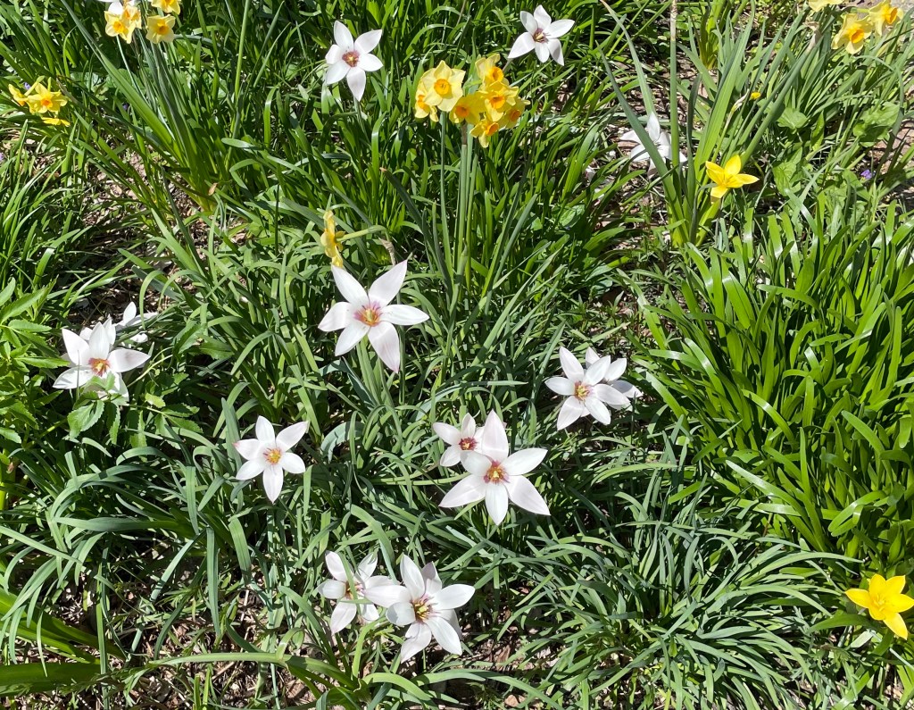 Here’s a medley of species tulips. They open and close each day in the most charming way, depending on the sunlight. I love them all, but the yellow and red one in the lower middle is my favorite. (The tulips are all sleeping now, so I can say that.) Apparently last fall we also planted 100 Clusiana Tubergen’s Gem bulbs. They were everywhere this spring, and I swooned over them.