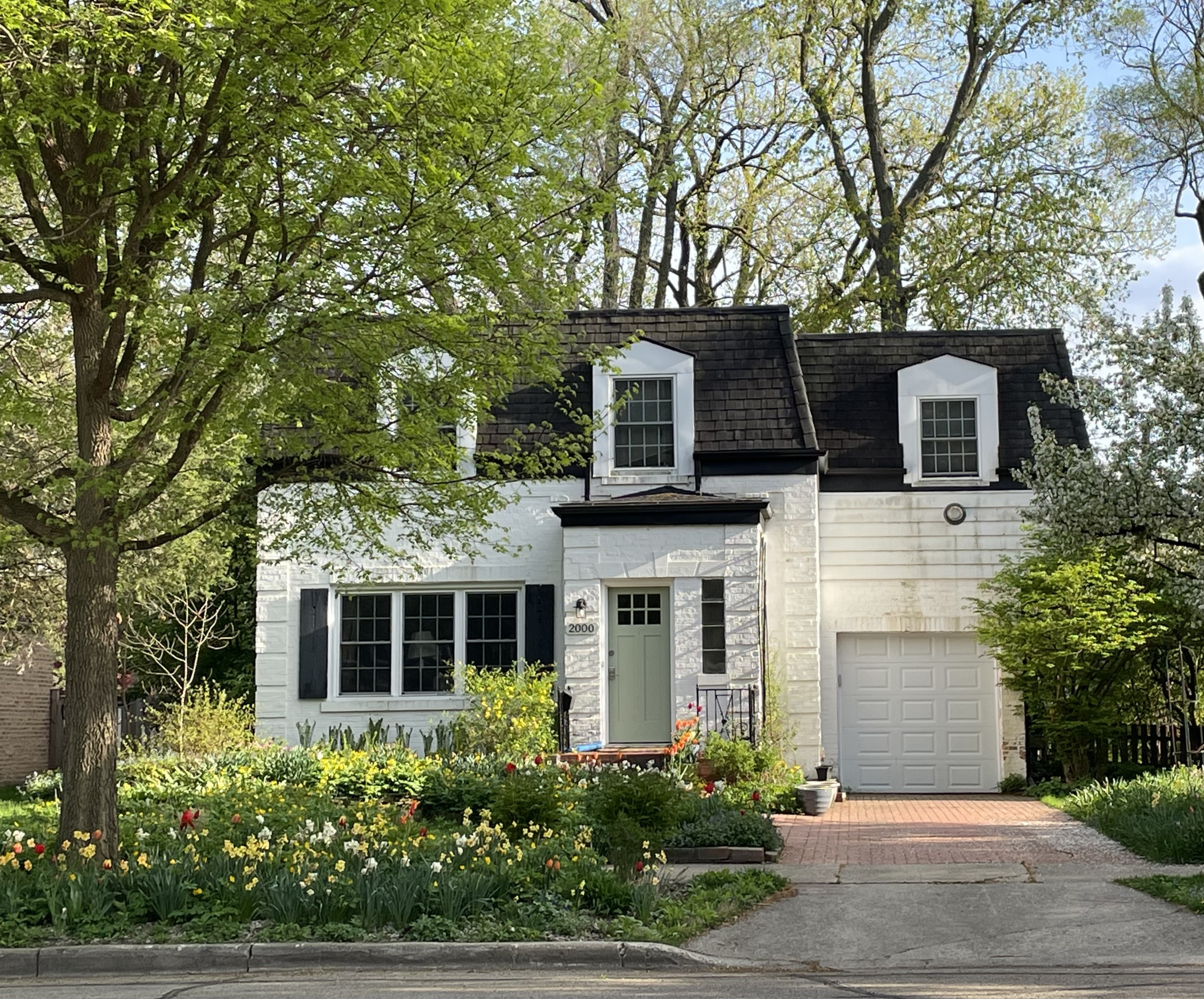 Here we have an early spring overview, with the bulbs up front. You can see the ostrich ferns coming up under the living room window, and the tulips in pots on the right side of the steps. Note how flat the garden is at this stage; no ten-foot cup plants or other tall perennials that will take over later. The new leaves on the trees are one of my favorite moments of spring.
