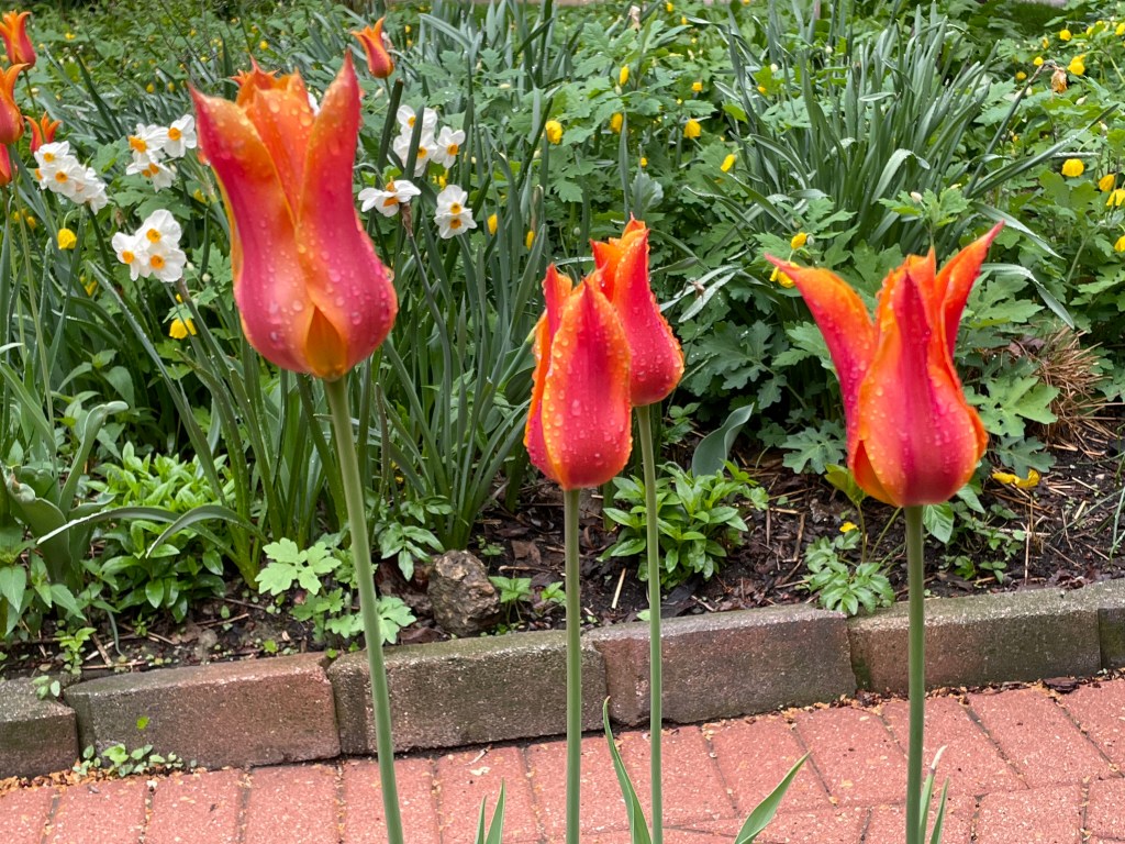 6. How nice to see how your garden is blooming. I am not one for tulips, however you have such pretty species ones. I love those thin orange and pink ones. I’ve never seen a two-headed tulip. Interesting, and odd. Take care.