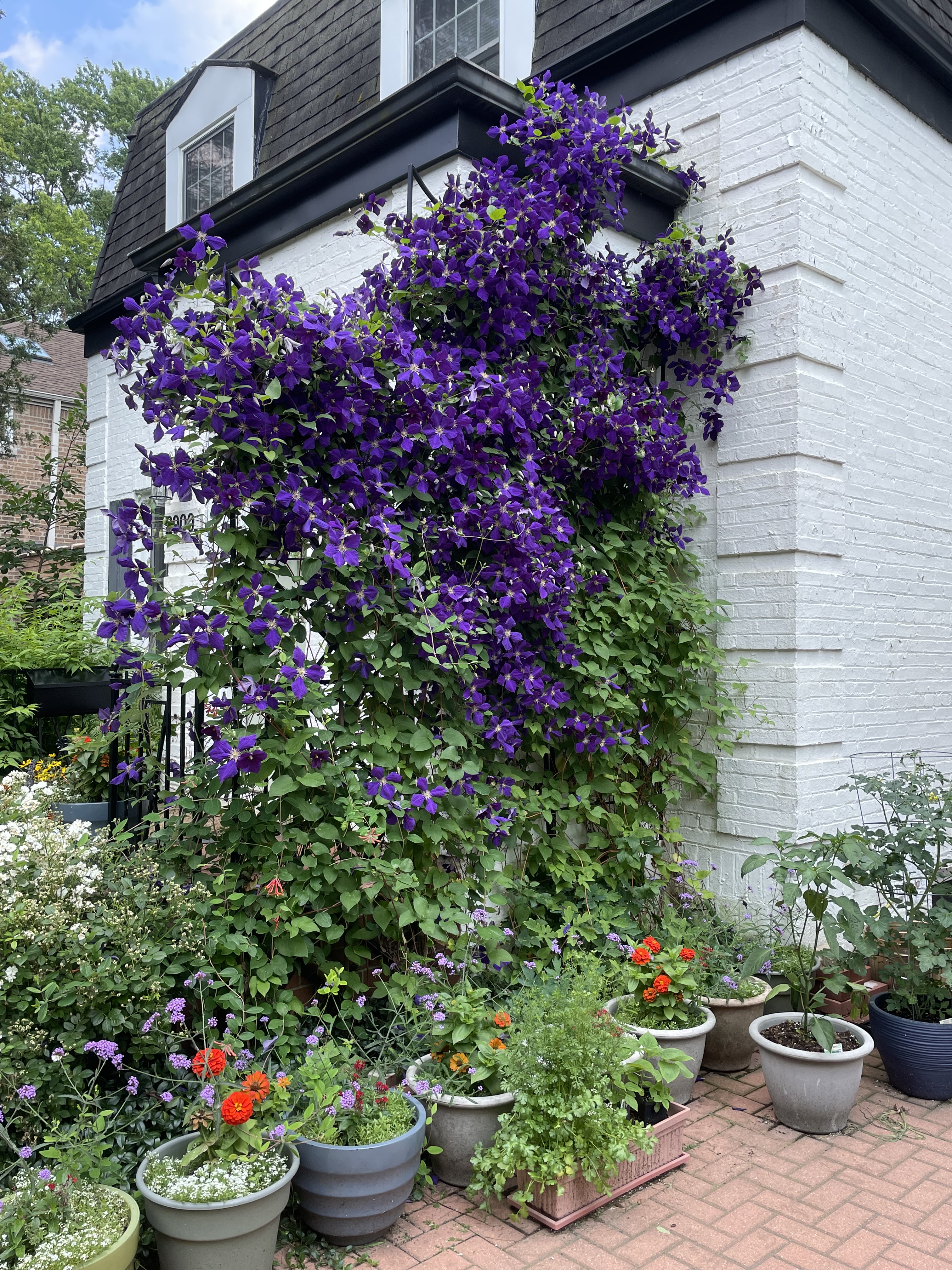 I’ve started out-of-chronological-order, because the Jackmanii is just dominating everything right now (but in a polite, well-mannered way). When I was in high school, the mother of one of my friends would say to us, when we were upset about something, “People driving by in cars won’t notice.” In this case, they do, and sometimes they pull over and comment, and it’s all good.