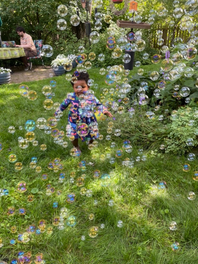 • Addie is certainly a delight to have around. She watches the bubbles, and I watch her playing with the bubbles. As I said to someone else above, I don’t know if I have any other speed than slow right now, so that’s how I’m going.