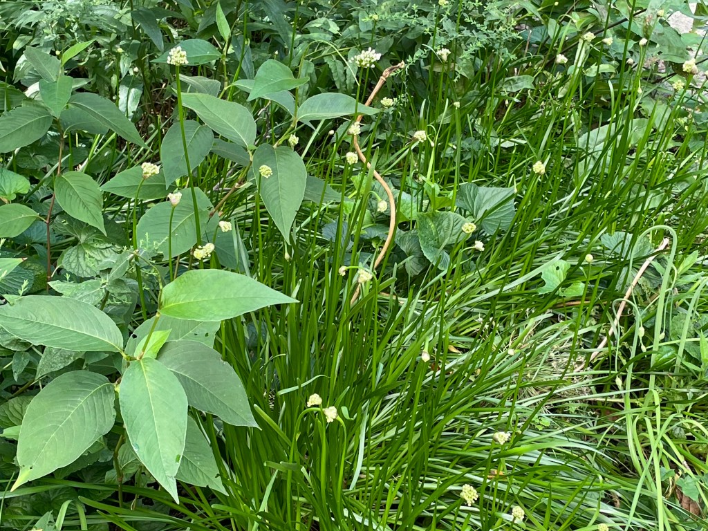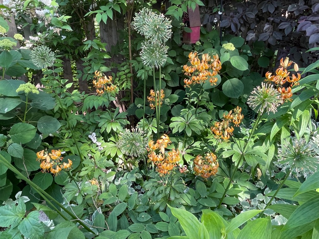 This is a lovely vignette, and I just wish I knew who those leaves on the left are. I probably knew last week, and hopefully I’ll figure it out again next week. The white pom-poms are allium about to bloom. There’s a bit of aster in the back, and some Solomon’s Seal. And I’m afraid there’s a bit of garlic?? You can see it’s not a simple garden. Layers, as they say in the books I’m reading.