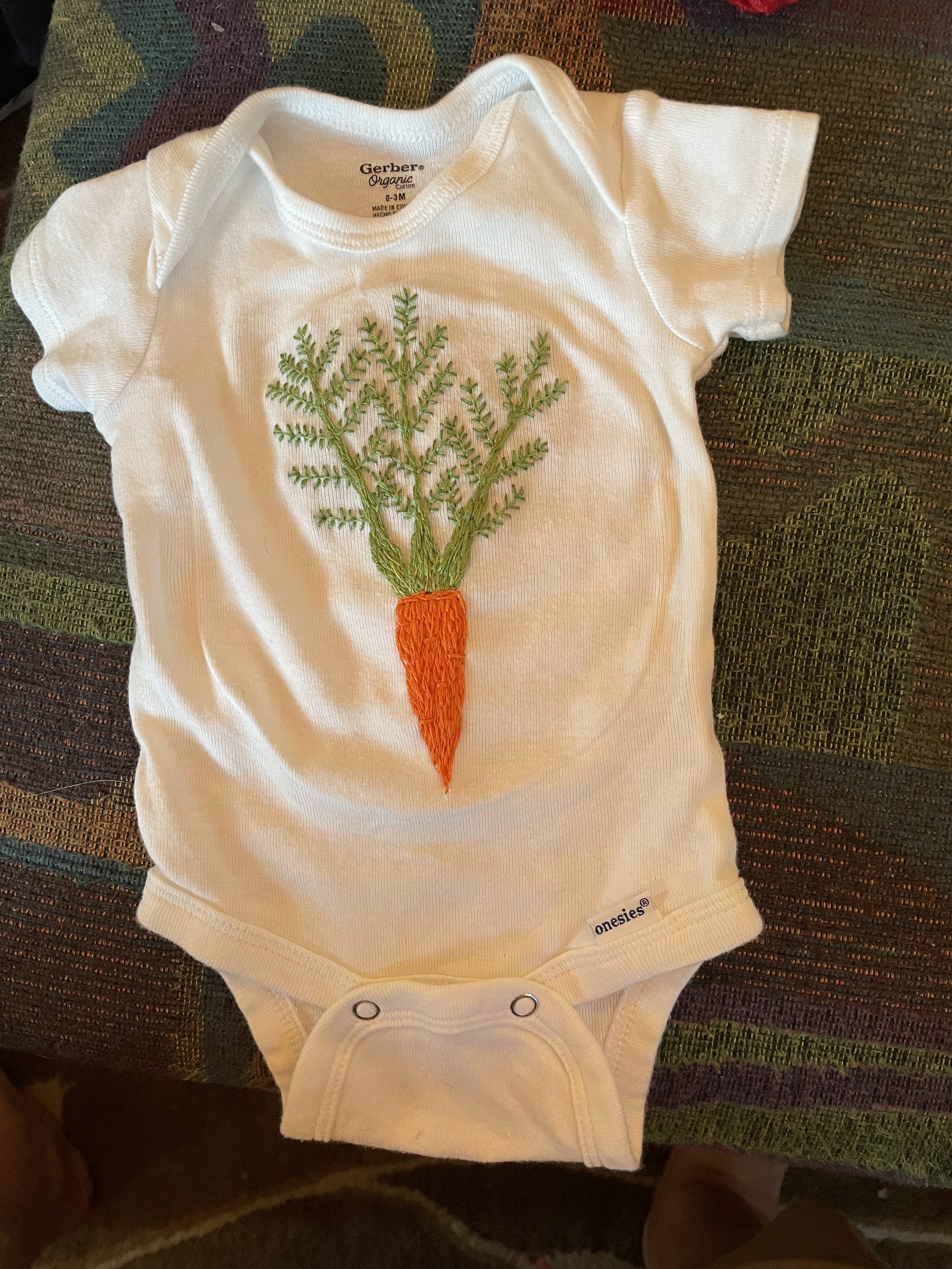 I also embroidered a number of onesies for Addie. That middle one is supposed to be a Christmas tree, but it looks more like the kind of tree that would keep you from reaching Beauty’s castle. On the right, a turkey, made without a pattern, just drawing around my hand the way kindergarteners do. The carrot is from an Aoki pattern.
