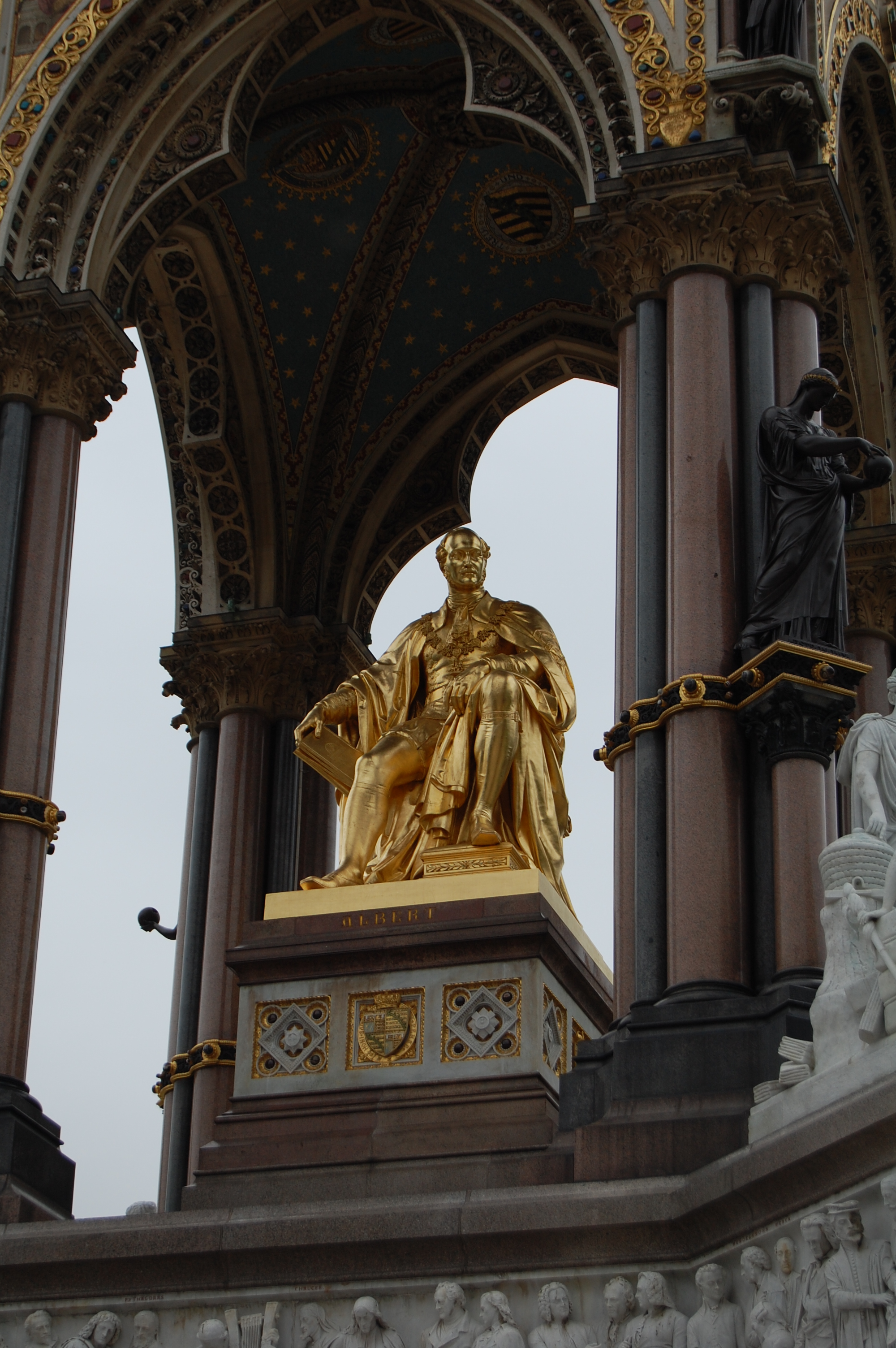 We discovered the Albert Memorial after passing into Kensington Garden. Judging from this monument, there was nothing reserved about Queen Victoria’s feelings for her late husband. The memorial is a bit over the top with heaps of statuary. At the four corners of the monument are figures representing the devastation felt at Albert’s death in all four corners of the globe. That’s what it seemed like anyway. I think the statuary above represents the Near East.