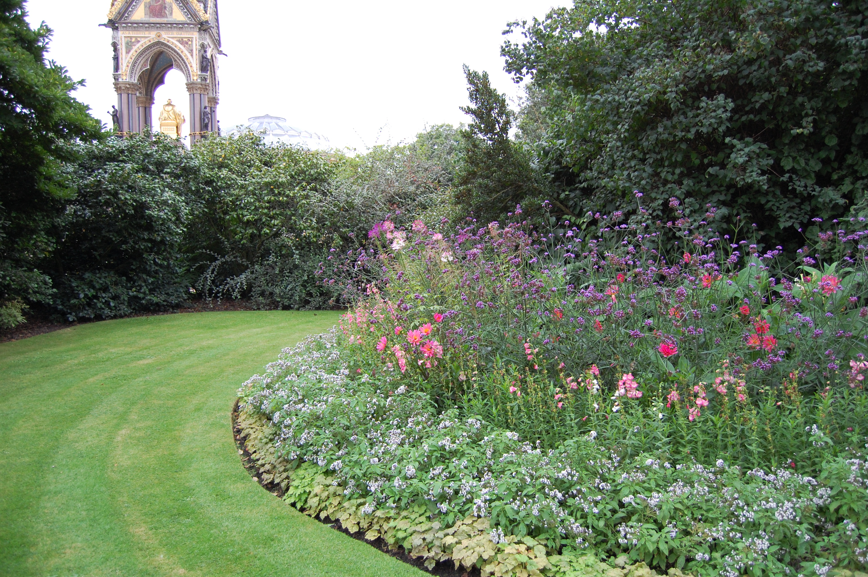 Kensington Garden flower walk with Albert Memorial in the background.