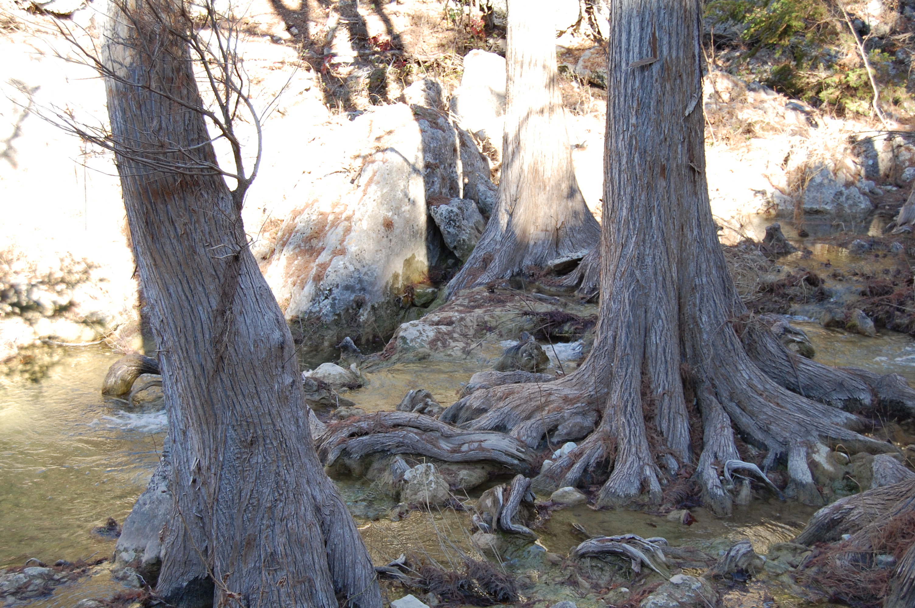 Hamilton Pool has been a popular swimming hole for many years, and swimming is still allowed (though not on the day we were there). To get there, you hike down into a canyon, then along Hamilton Creek for about half a mile. I should mention the light was tricky, with a bright sun low in the sky.