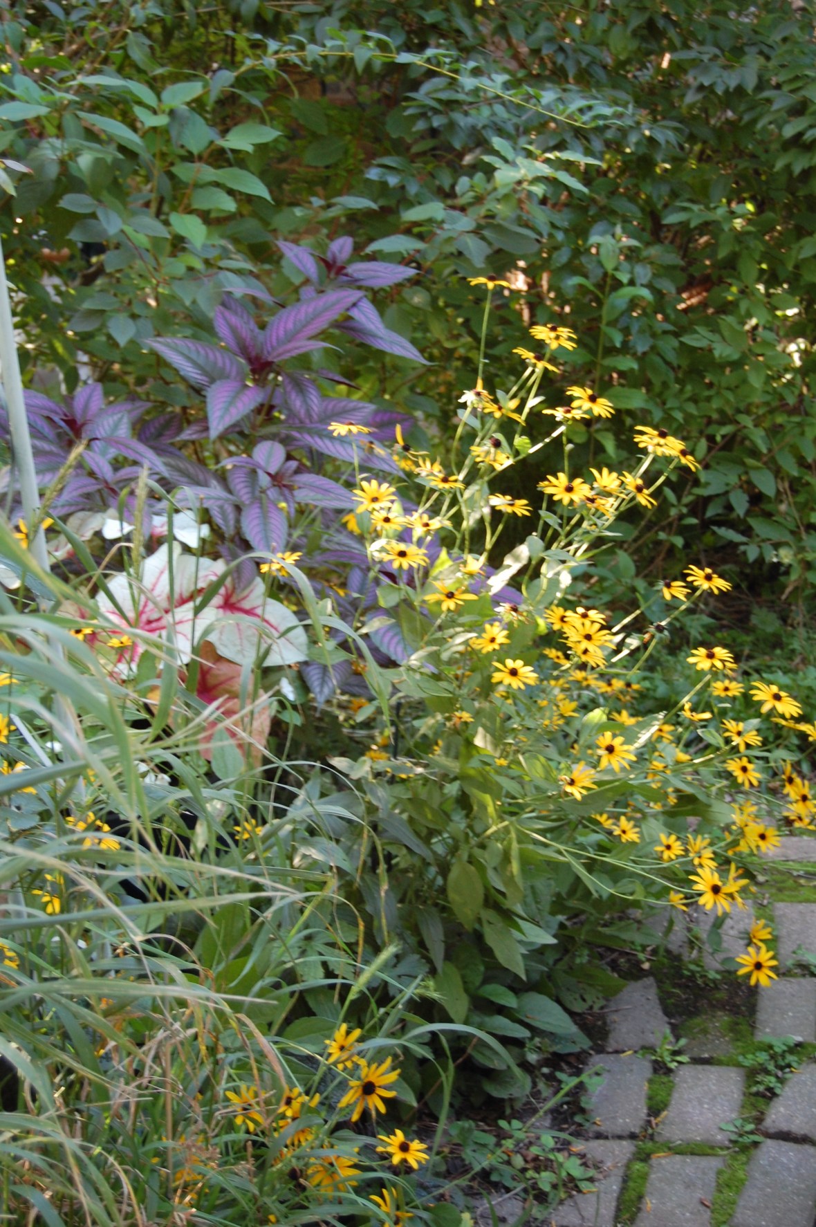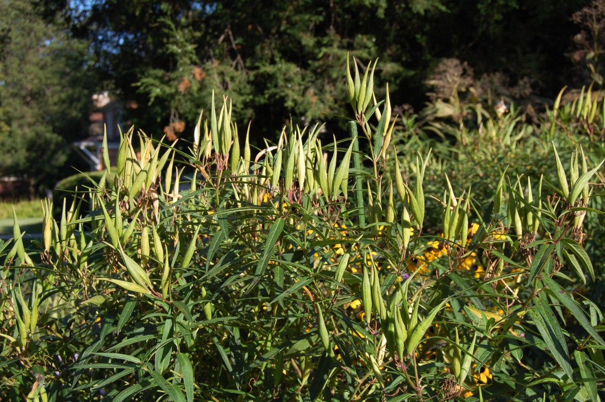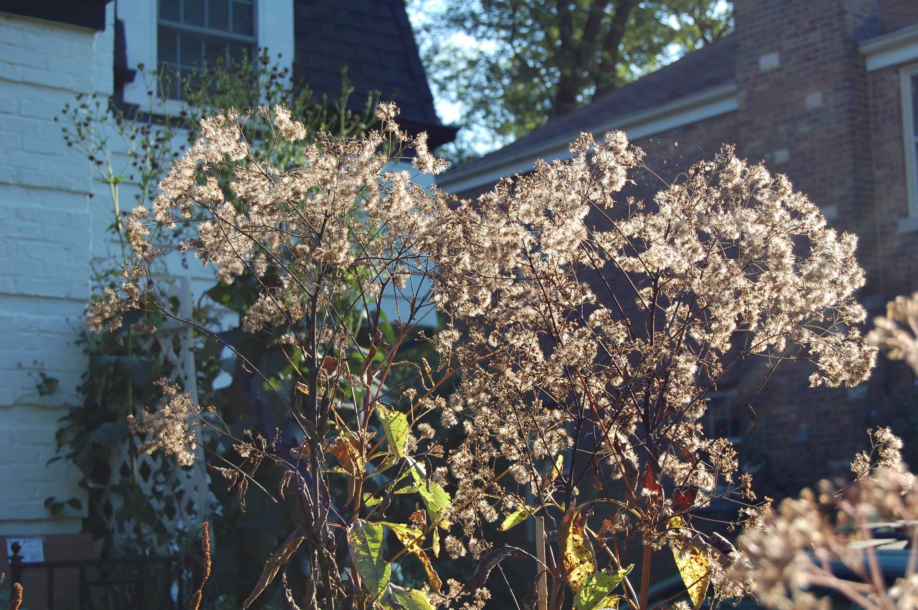In his front yard, Richard took down a big Norway Maple (Acer platanoides) and replaced it with a Burr Oak (Quercus macrocarpa), now only about 4′ high. The rest of the front is planted in native perennials and shrubs, including Black Chokeberry (Aronia melanocarpa) and a Redbud (Cercis canadensis). Along the street he’s planted a “lawn” of Pennsylvania Sedge (Carex pennsylvanica) that is spreading very nicely. It’s remarkable that this garden has received no supplemental water (except from a water barrel), even with the drought.