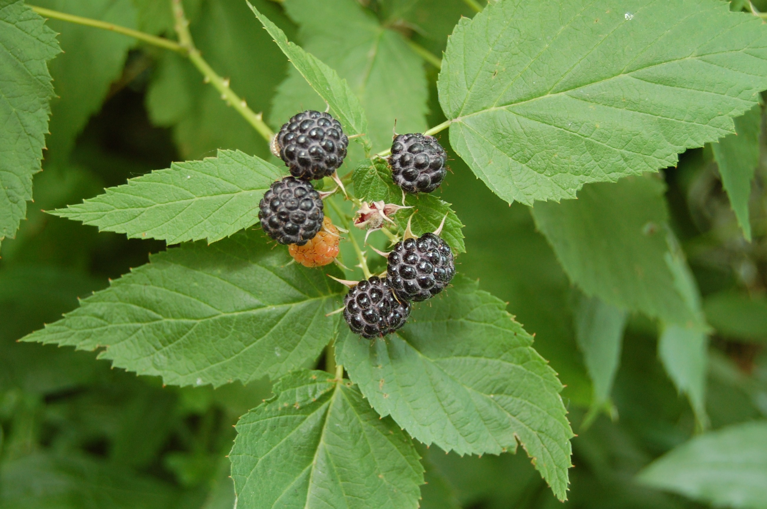 Then came the next devlopment: raspberries. Thanks to some visiting bird, raspberry canes started popping up in the wild bed. Last year and this they have yielded a growing number of really delicious black raspberries.