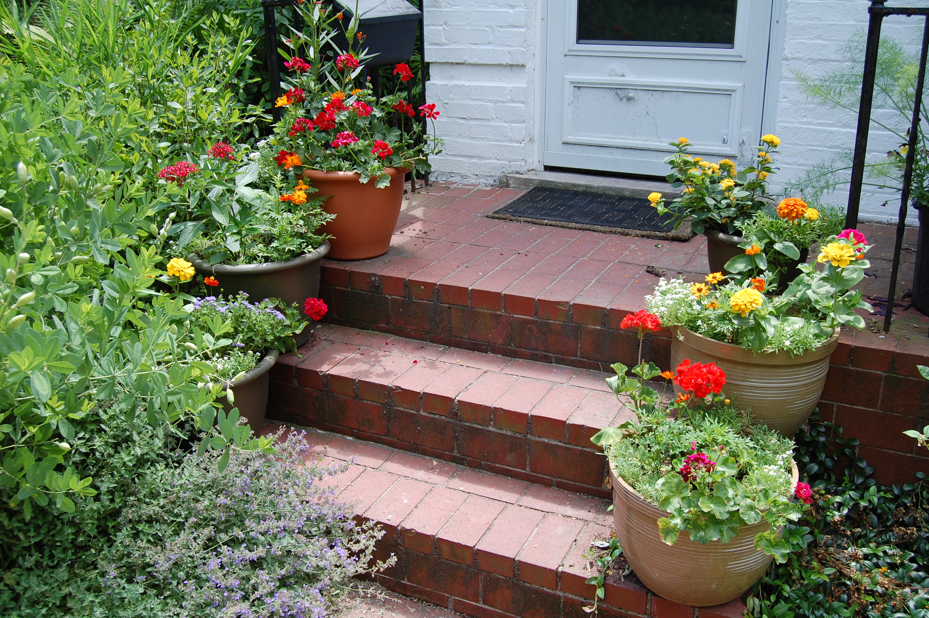 Containers Full of Summer Annuals. So I’ve chosen the summer annuals, and now it’s just a question of watering and watching how they do. The containers in the front are mostly hot colors: red, orange, and yellow; with some blue and white for counterpoint. In the shadier back, the colors are cooler: mostly shades of white and blue. Most of the pansies ended up on the compost pile, but I’ve kept some of them and will cut them back later in the summer.