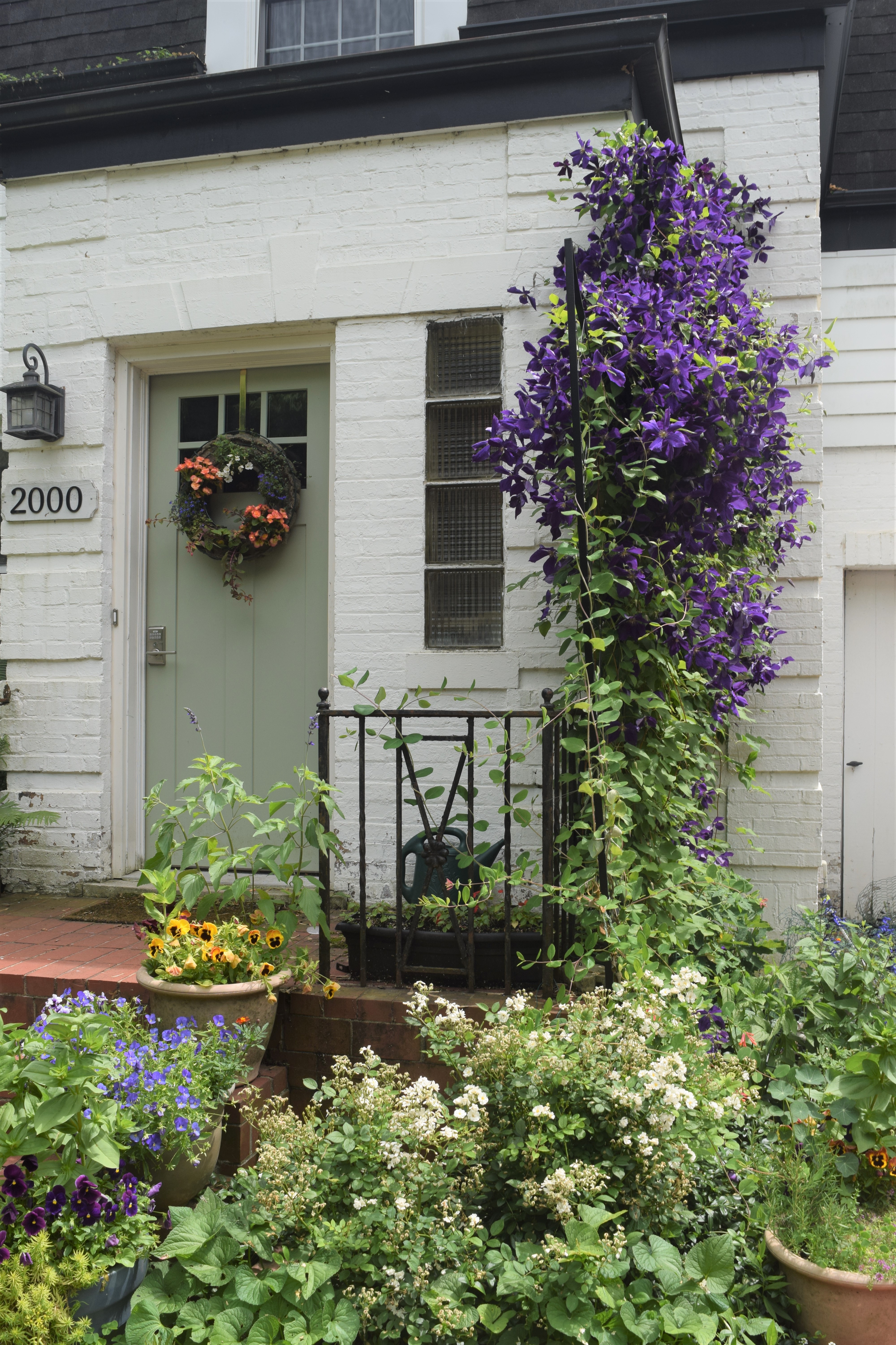 Right now is the peak Clematis moment here in our garden. This refers, first of all, to what we call the Great Wall of Purple filled out by Clematis ‘Jackmanii’ on part of the west-facing wall of the house, around the corner from the front door.