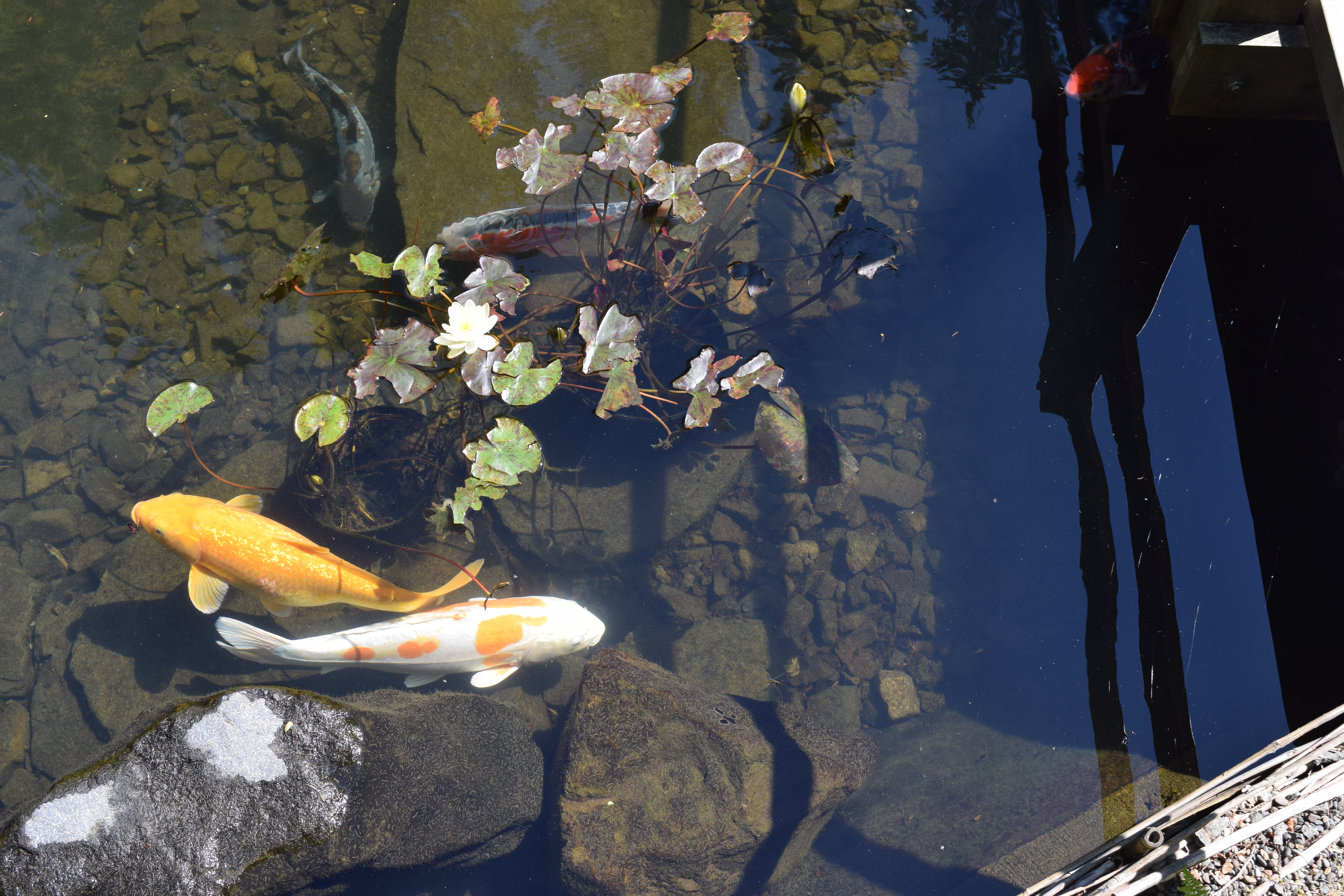 In summer there is not a great deal of color, though there are a few irises blooming – and koi.