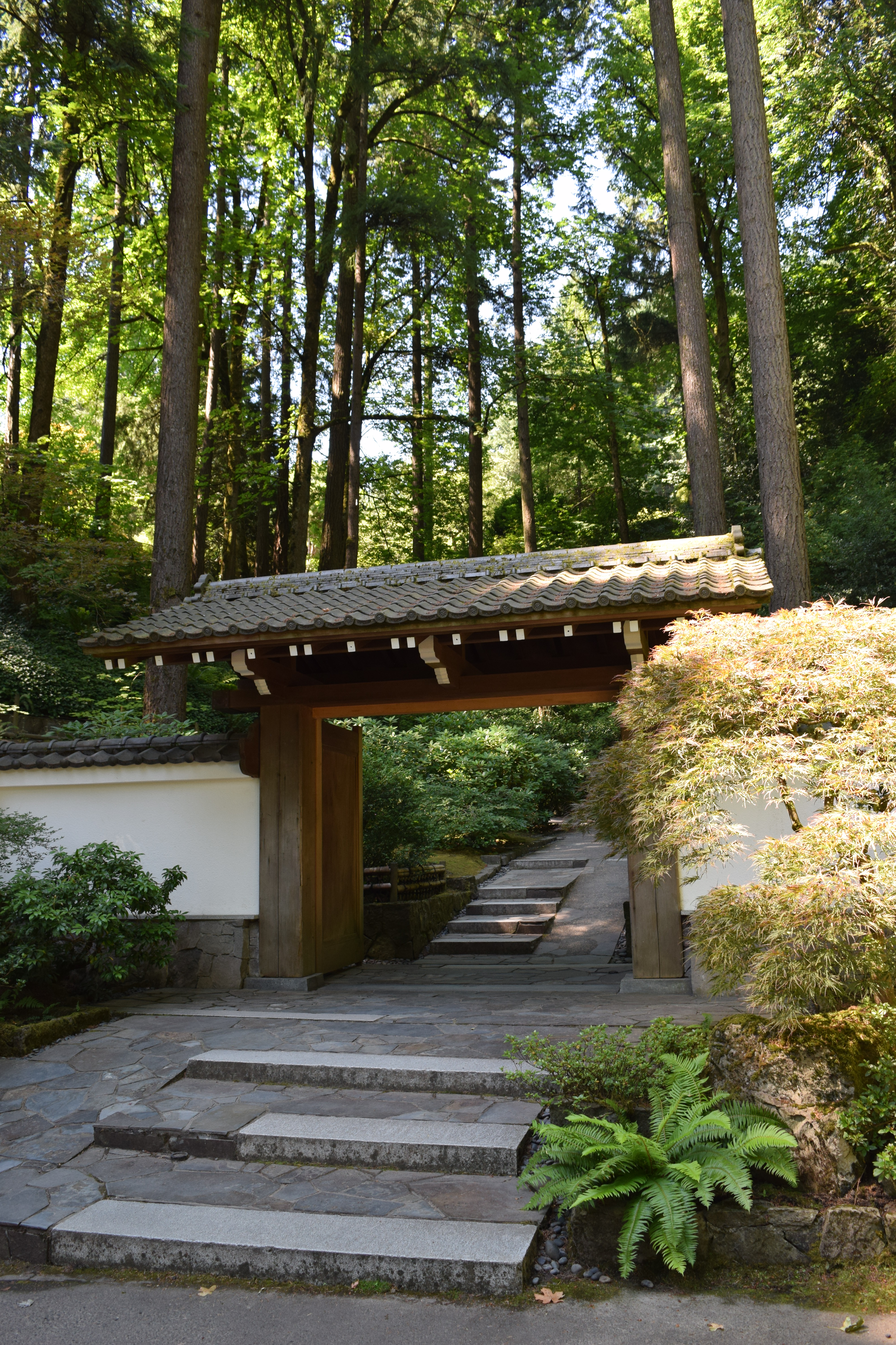 Trees of the Pacific Northwest tower over the entrance to the Portland Japanese Garden.