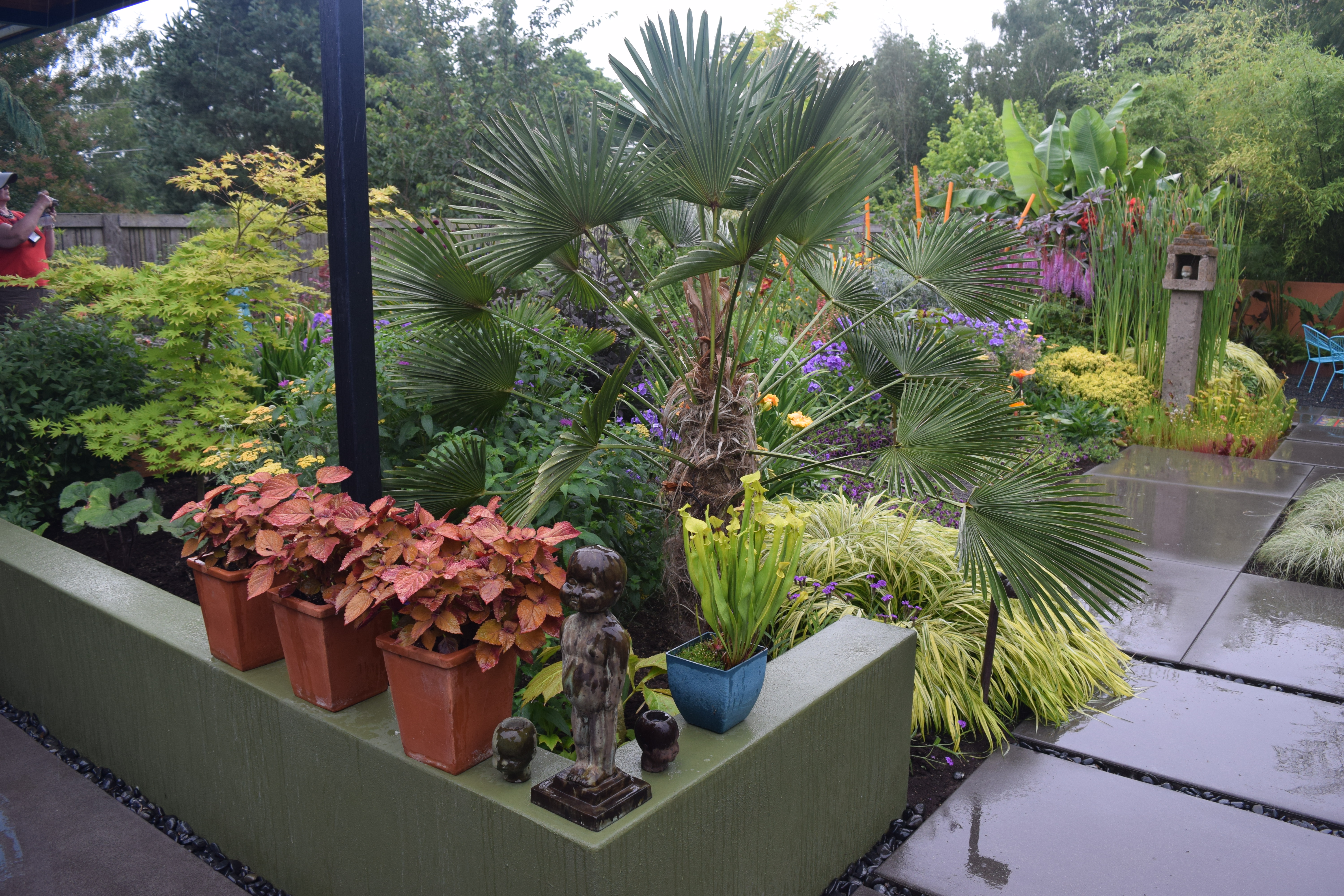The mix of plants seems part English cottage garden and part Southern California, with a bit of the tropics thrown in for good measure.