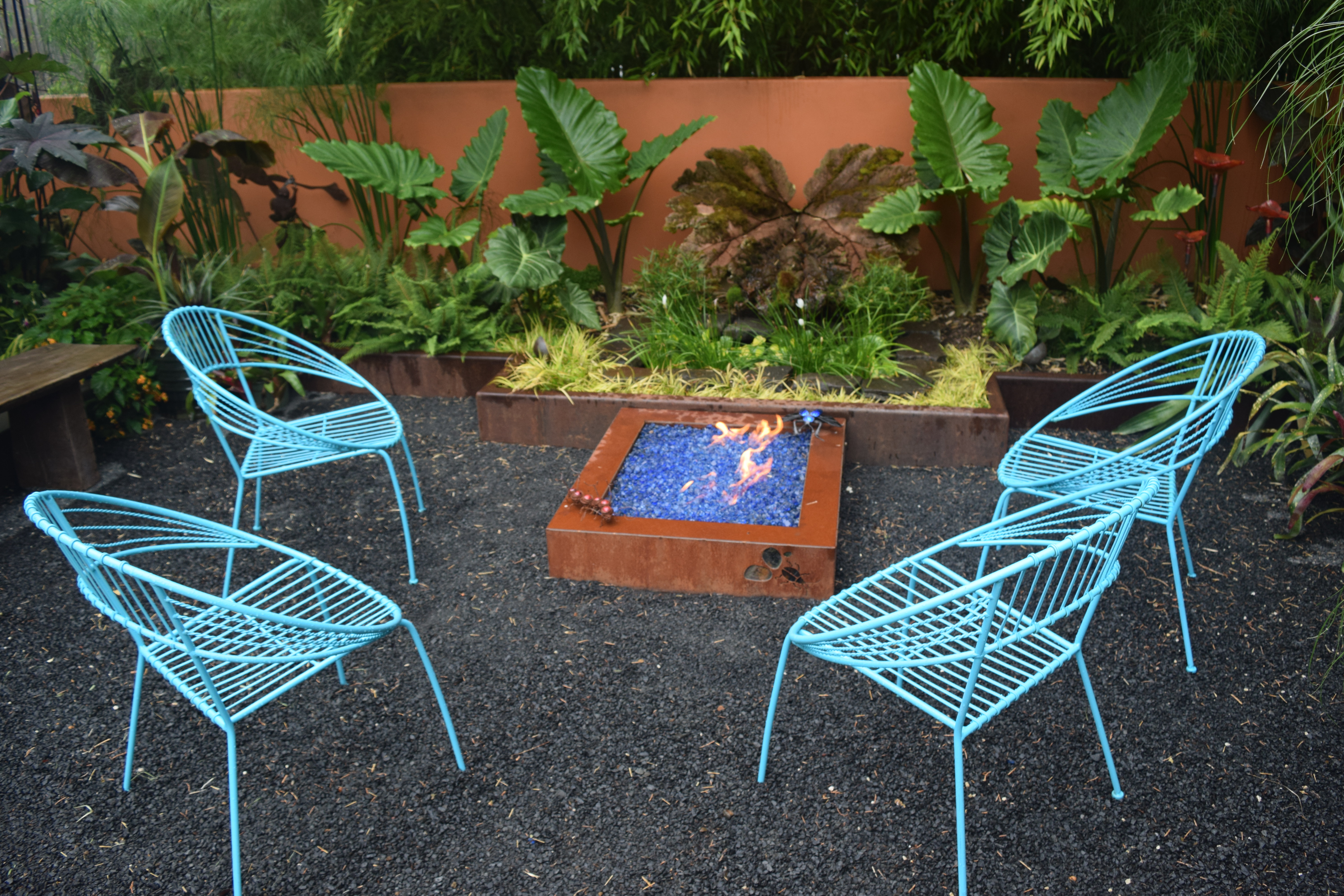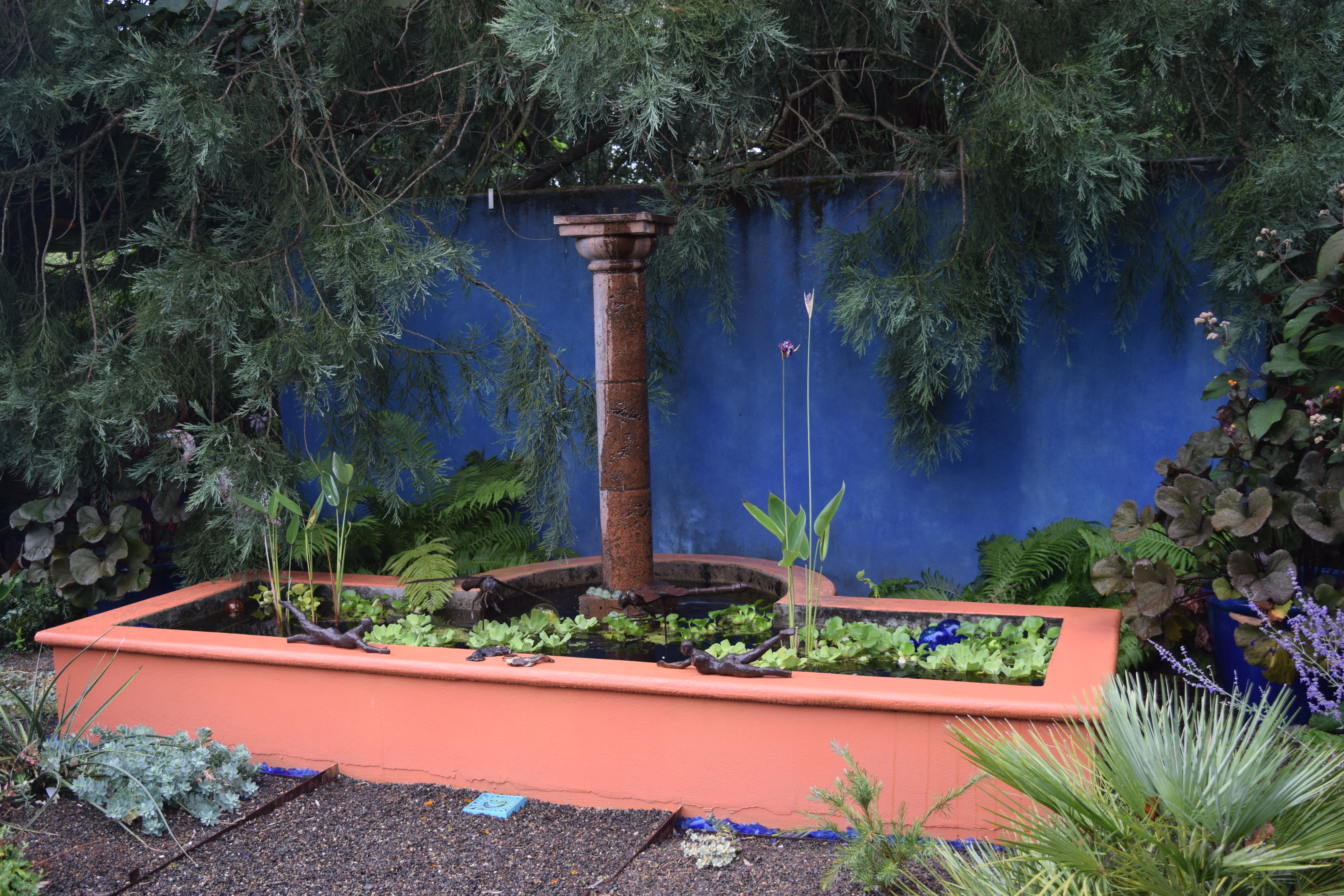 This water feature against a blue wall provides both a focal point and a space to congregate.