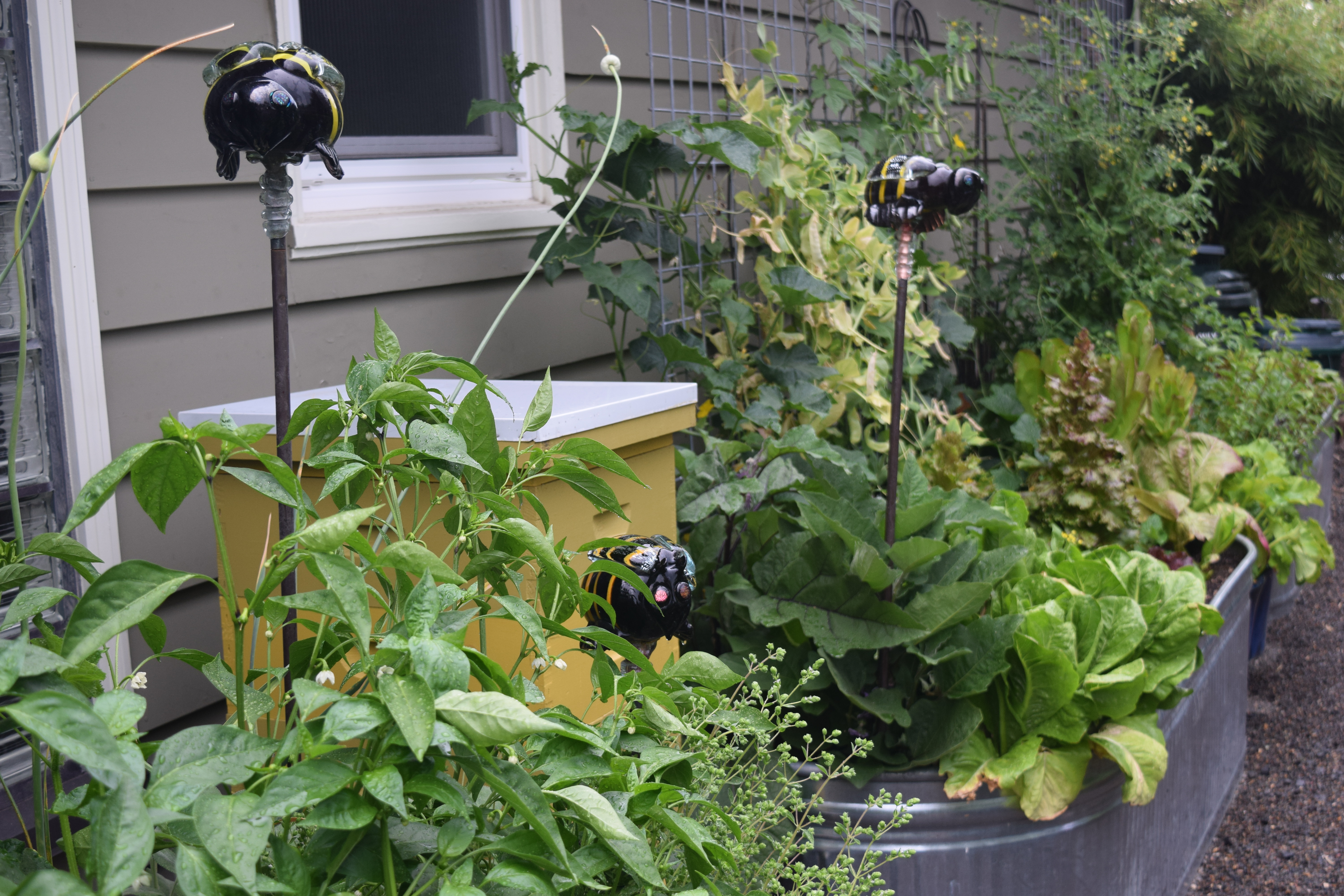 Last but not least, I have to mention the space created on one side of the house for beehives and growing edibles in large stock tanks.