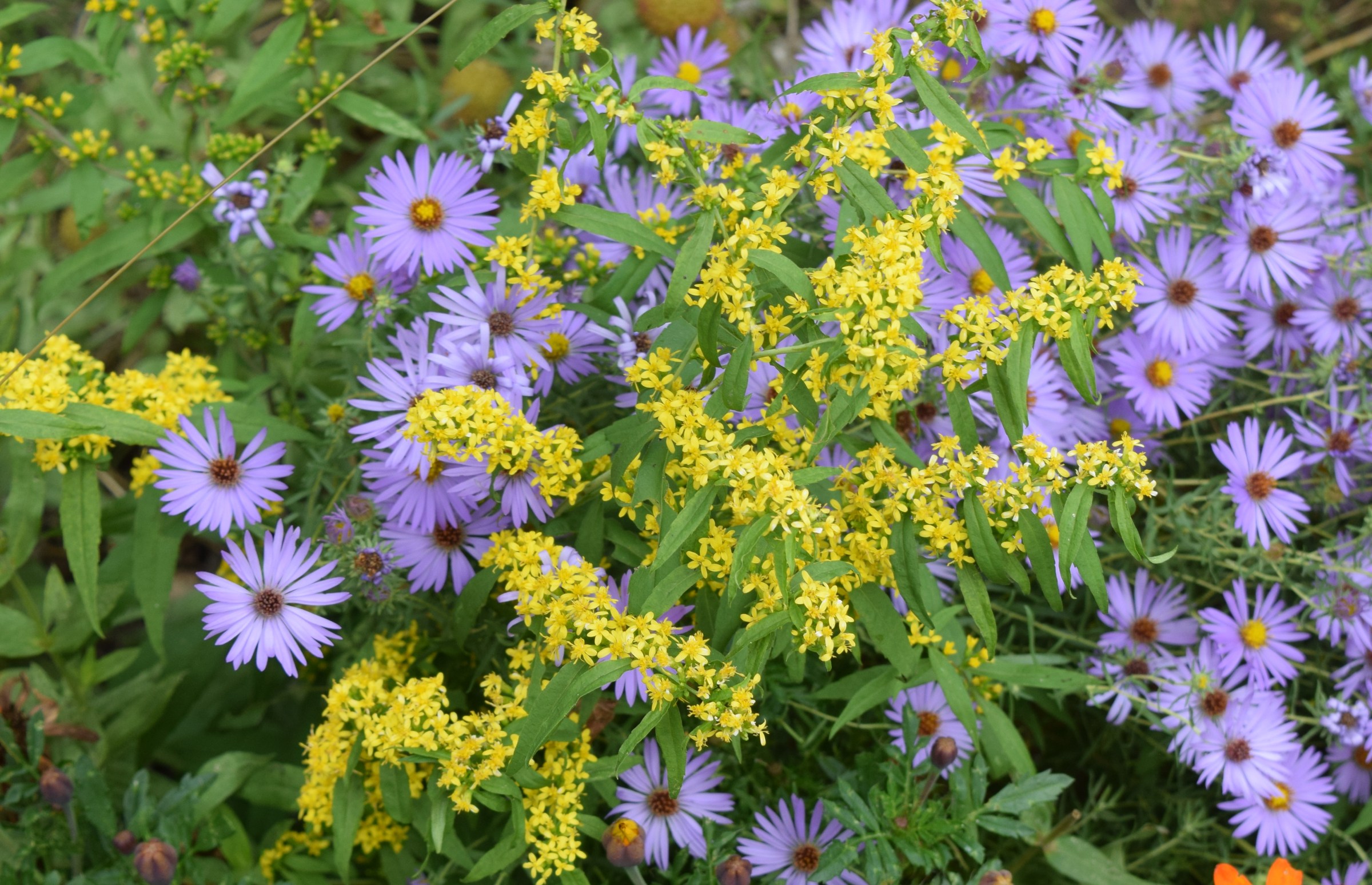 Currently we don’t have any of the tall goldenrods in the garden, except for a few volunteer wildlings scattered in corners here and there. We do have a lot of Bluestem Goldenrod (Solidago caesia), however.