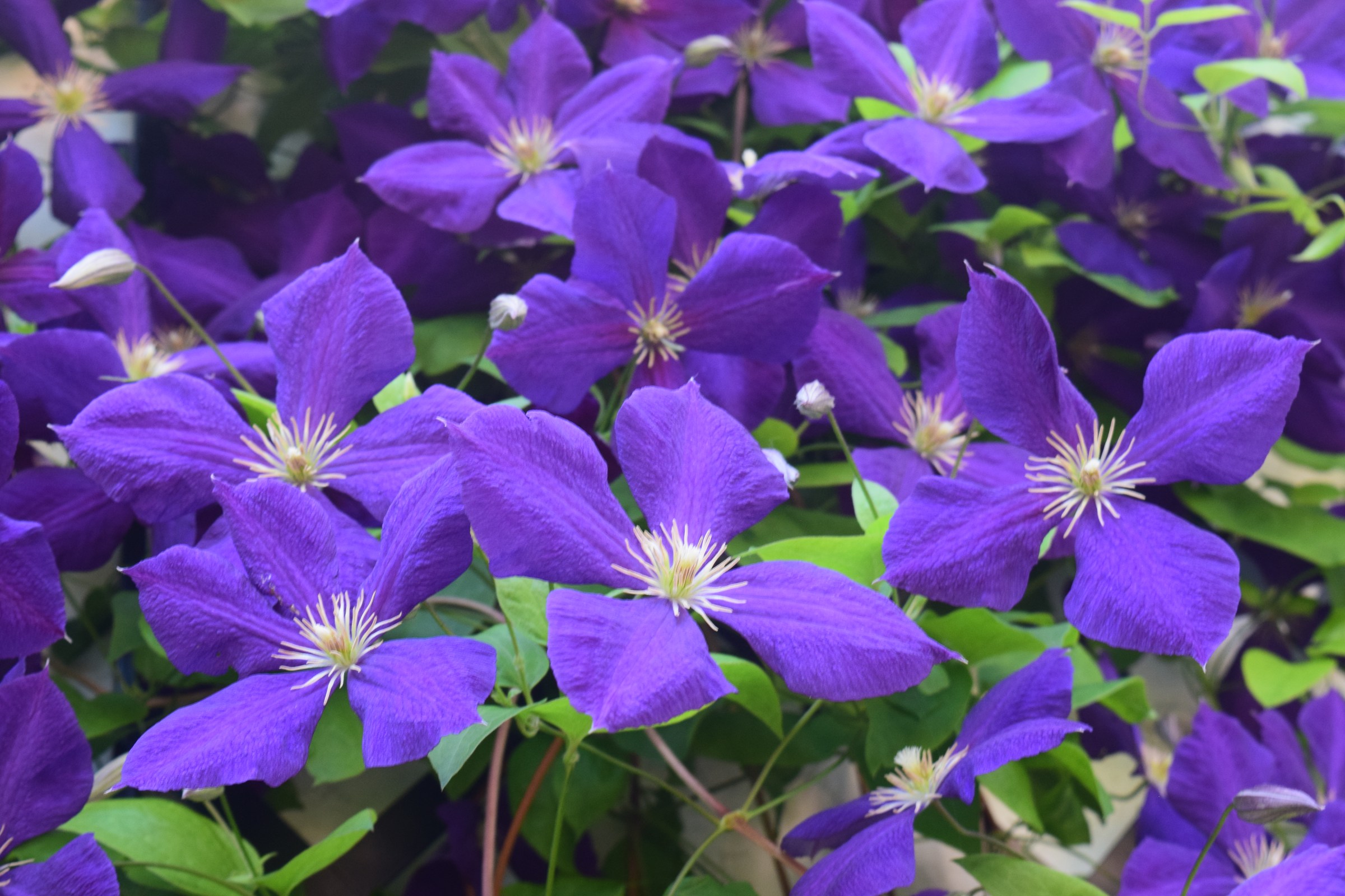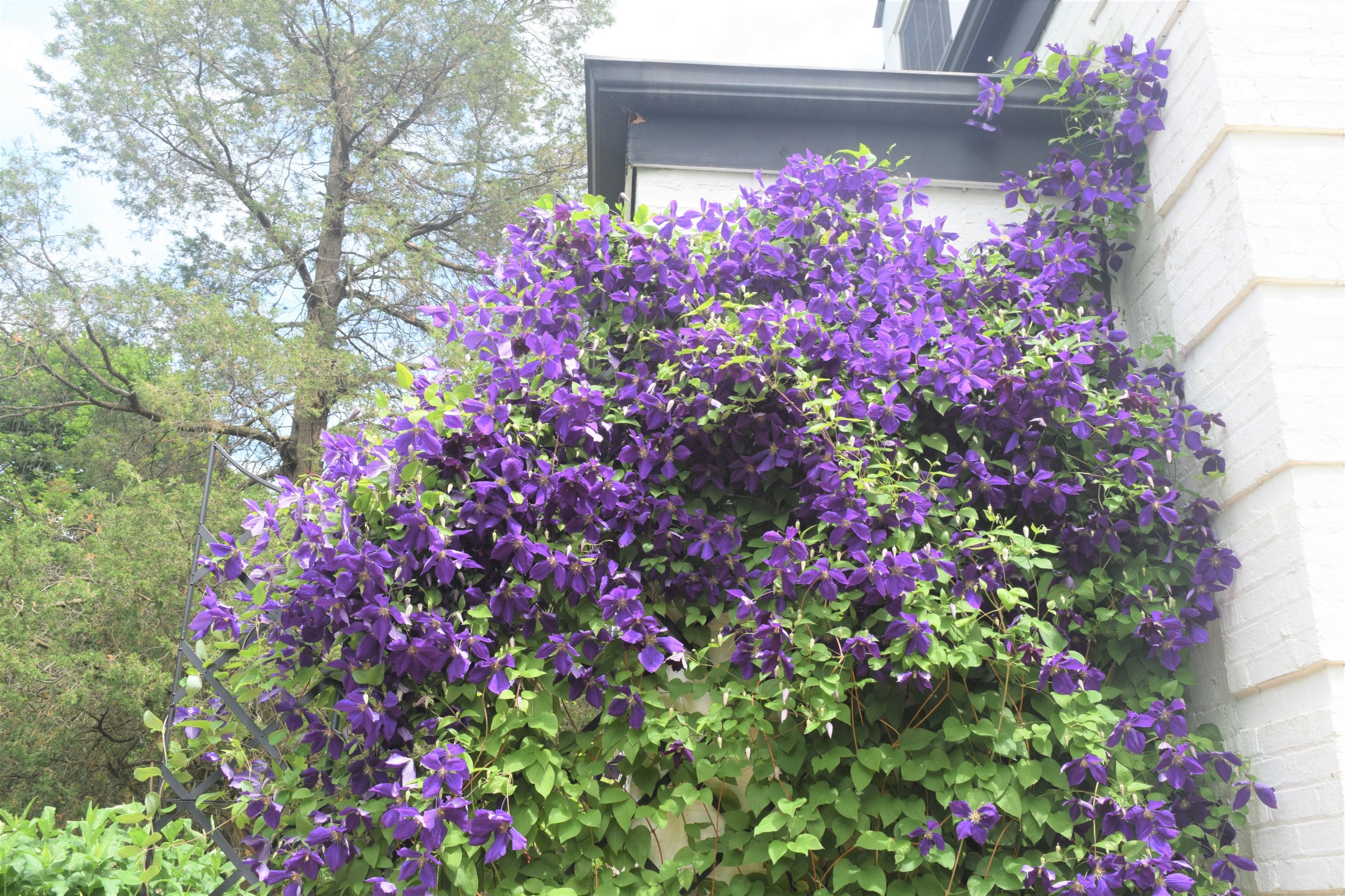We’re really super proud of our Clematis ‘Jackmanii’. Every year it climbs a trellis that stretches up about 12 feet, all the way from the ground to the roof gutters.