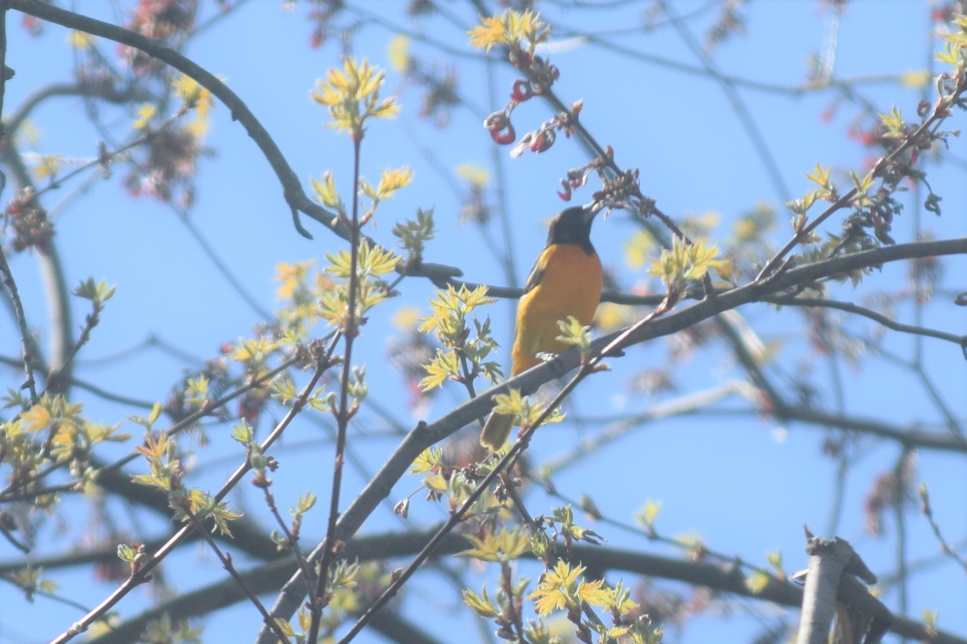 The Baltimore Orioles were supposed to arrive early this year (according to people who know their birds), but came late instead. Normally they arrive right around May 1, but this year Judy saw our first Oriole on Thursday, May 5. Perhaps our topsy turvy spring weather first hastened and then delayed their arrival.
