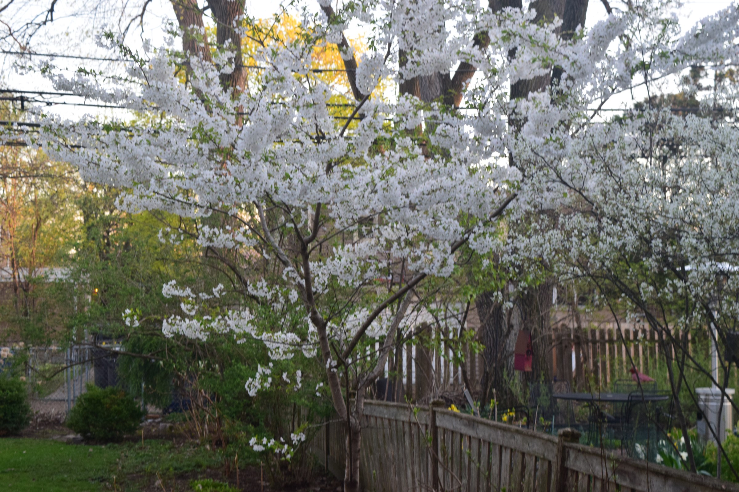 When neighbors plant a new tree on their side of the property line, it feels to me like I’ve got a new tree of my very own. In this case the tree is a Yoshino Cherry (Prunus x yedoensis), and its first season of profuse bloom is happening right now.
